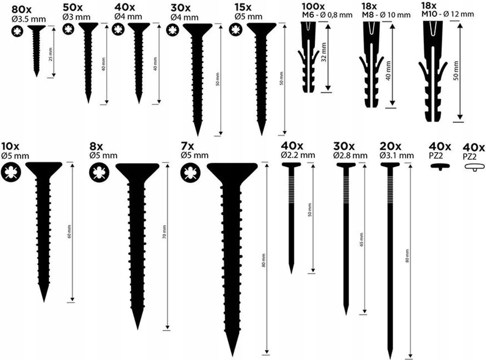 Śruby PZ2: 50 × 4 × 30 mm, 40 × 4 × 40 mm, 30 × 4 × 50 mm, 15 × 5 × 50 mm, 10 × 5 × 60 mm, 8 × 5 × 70 mm, 7 × 5 × 80 mm