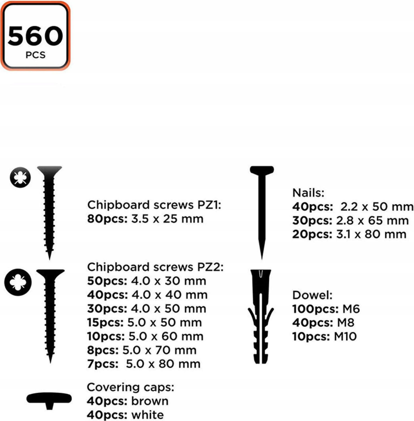 - Zawiera śruby, gwoździe, kołki i zaślepki w różnych rozmiarach