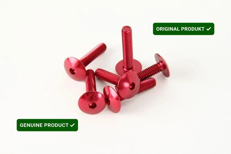 Zestaw sześciu śrub owiewki M6x30 w kolorze czerwonym, wykonanych ze stali, z płaską główką imbusową. Przeznaczone do montażu elementów owiewek motocyklowych, zapewniając estetyczne i pewne mocowanie.