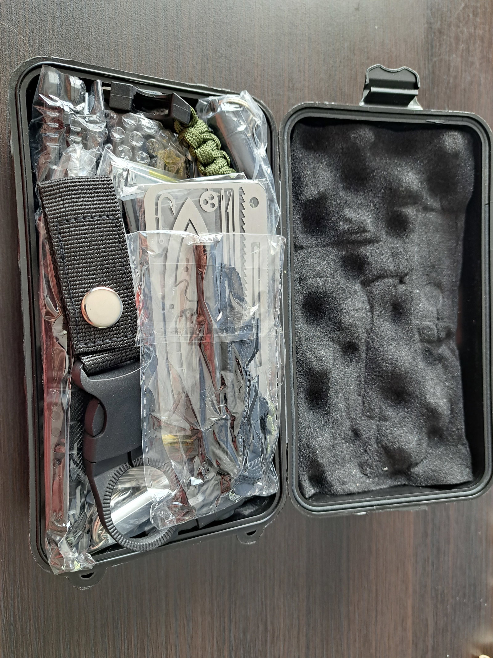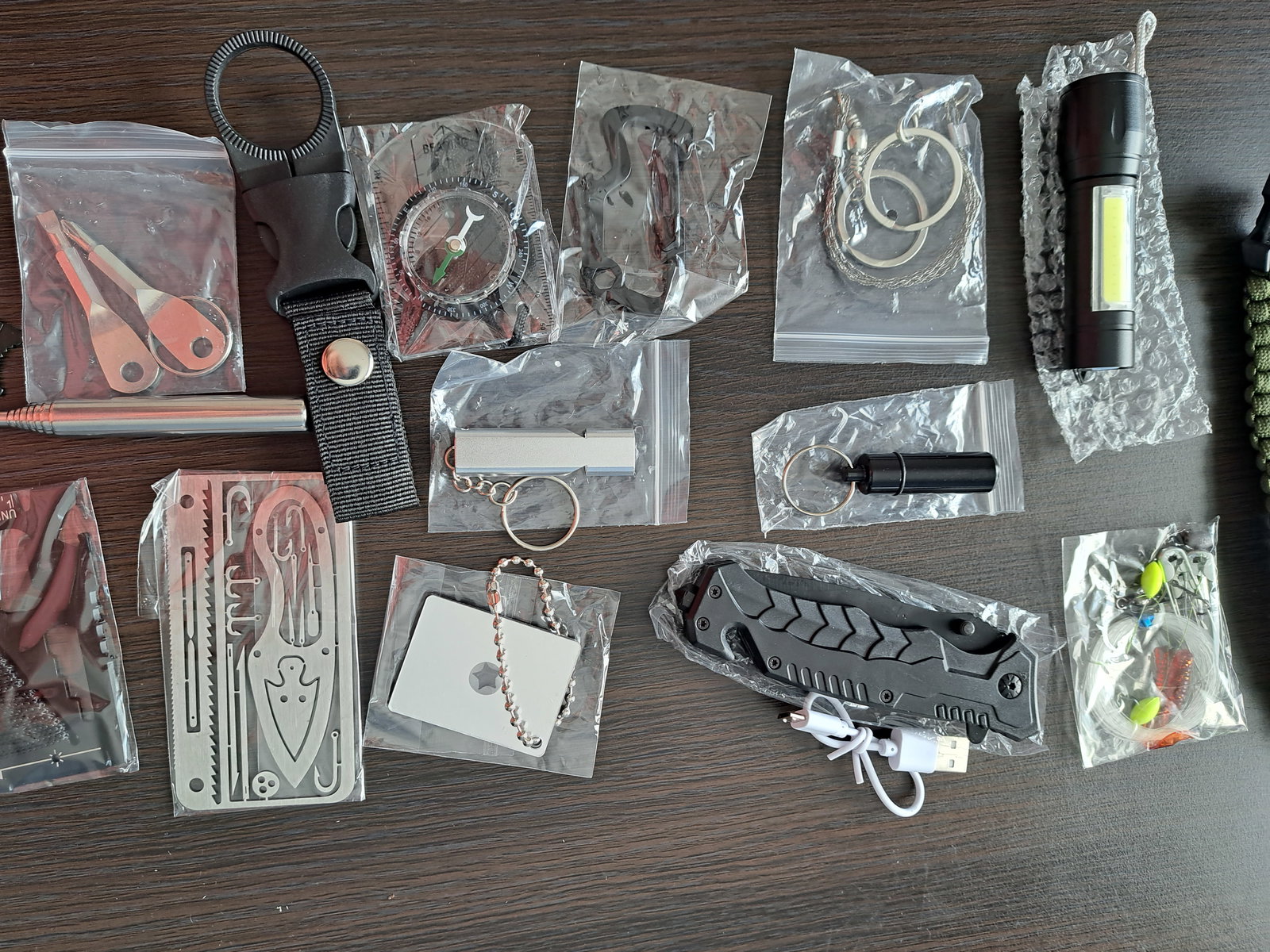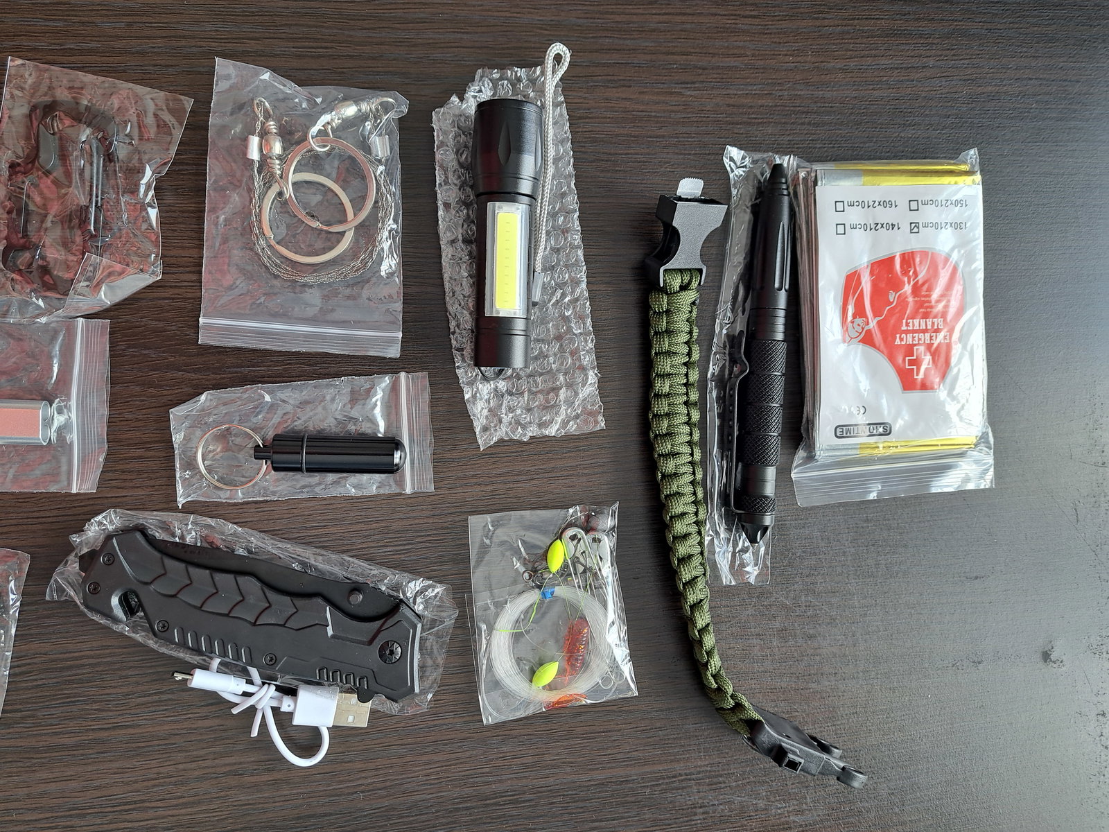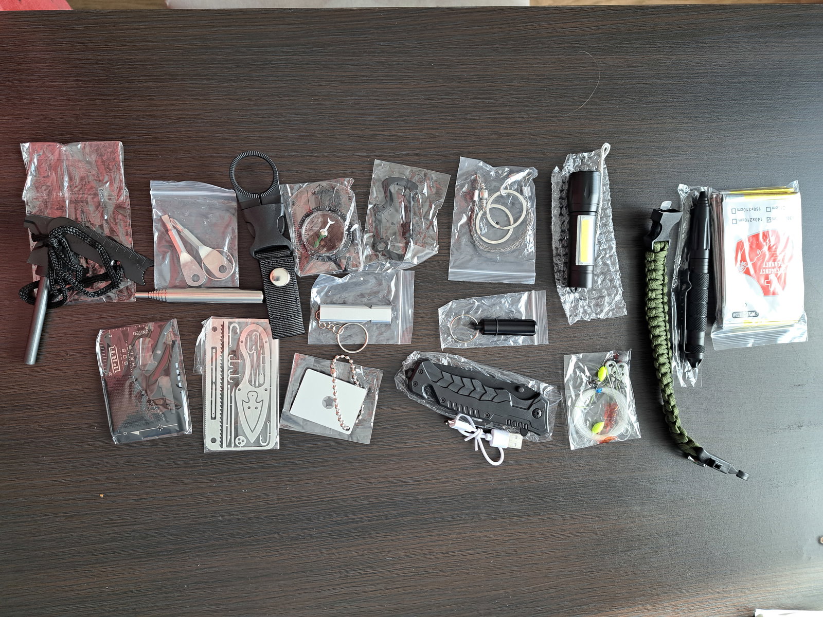 1. Nóż. 2. Latarka. 3. Długopis taktyczny - kubotan. 4. Zestaw do wędkowania, np. żyłka. 5. Stalowy gwizdek alarmowy. 6. Krzesiwo. 7. Blaszka do krzesania z miarką i otwieraczem do butelek. 9. Sznurek. 10. Koc termiczny 130x210. 11. Śrubokręty x 2. 12. Piła. 13. Bransoletka - linka,nóż, krzesiwo, kompas, gwizdek. 14. Uchwyt do butelek. 15. Składana płomieniówka. 16. Kompas. 17. Kabel USB. 18. Brelok - pojemnik na tabletki. 19. Karabińczyk z otwieraczem. 20. Lusterko - odbijające światło słoneczne. 21. Karta wielofunkcyjna. 22. Karta wielofunkcyjna. 23. Pudełko do przechowywania.