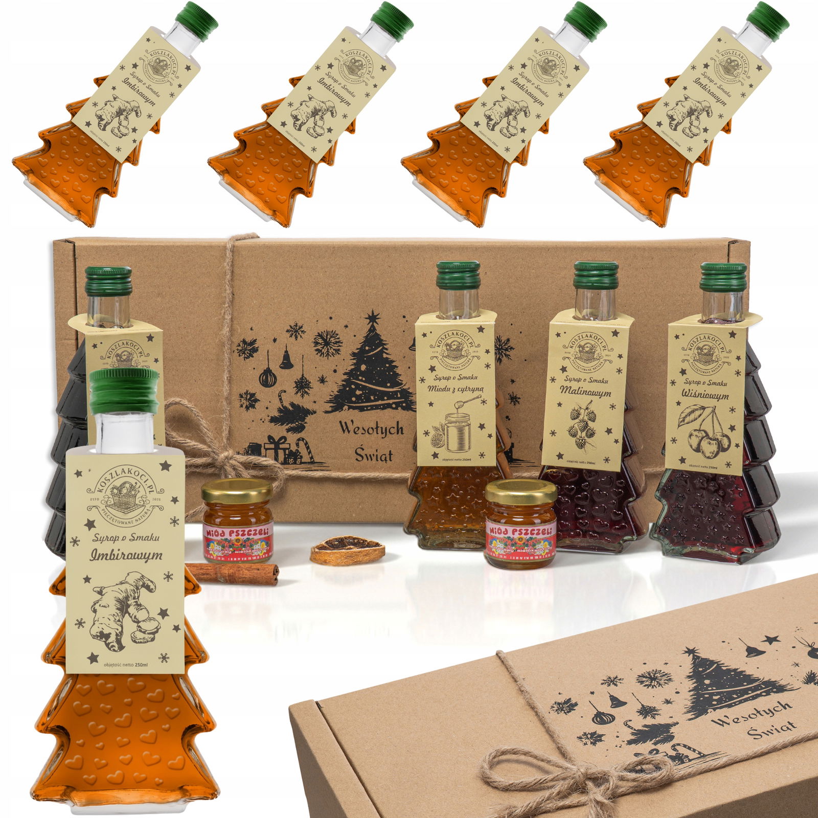 Wyjątkowy zestaw 4× syrop imbirowy w przepięknych, szklanych butelkach w kształcie choinki, ozdobionych wypukłym tłoczeniem GWIAZDEK. ⭐?✨