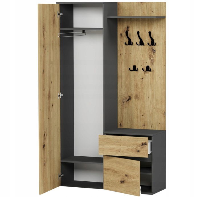 - Szafka z Drzwiami i Szufladą:Praktyczne rozwiązanie do przechowywania obuwia i innych drobnych przedmiotów.Wyposażona w półki oraz szufladę na drobiazgi.Możliwość montażu drzwi na lewą lub prawą stronę, dopasowując do potrzeb użytkownika.Dodatkowe wieszaki na zewnętrznej stronie szafki, zwiększające funkcjonalność.