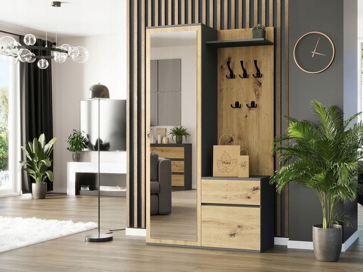 - Funkcjonalność i Organizacja: Zestaw zapewnia odpowiednie miejsce na przechowywanie odzieży i obuwia, pomagając utrzymać porządek w przedpokoju.