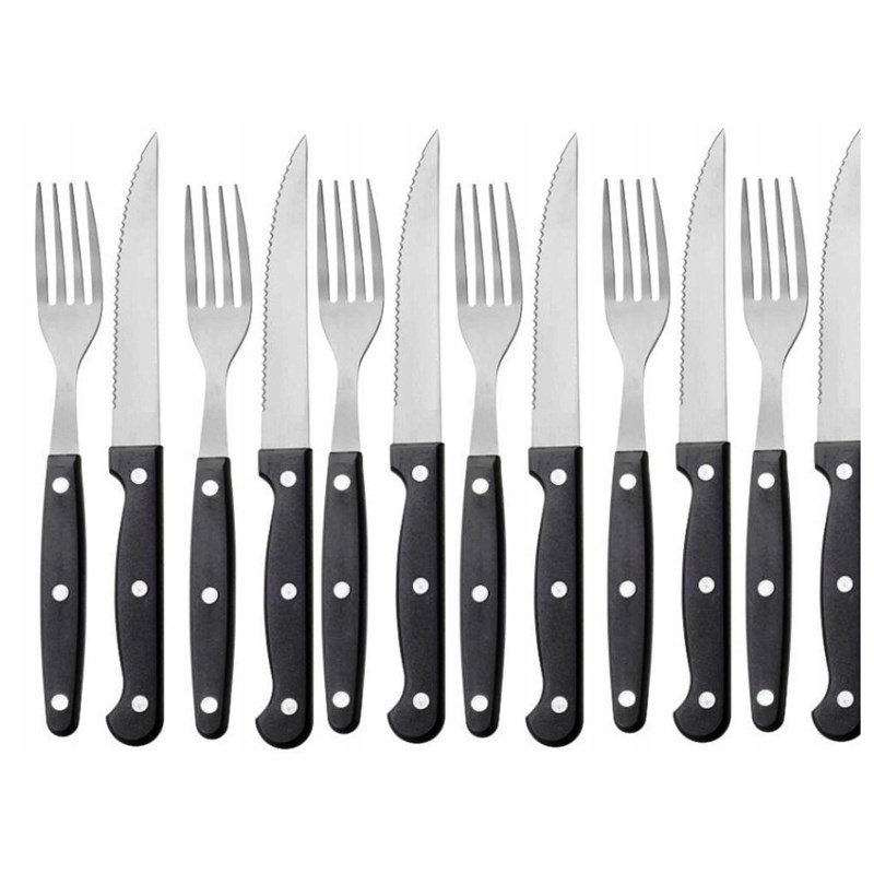 Zestaw sztućców do steków – 12 elementów (6 noży 22 cm, 6 widelców 19,5 cm), czarne plastikowe uchwyty