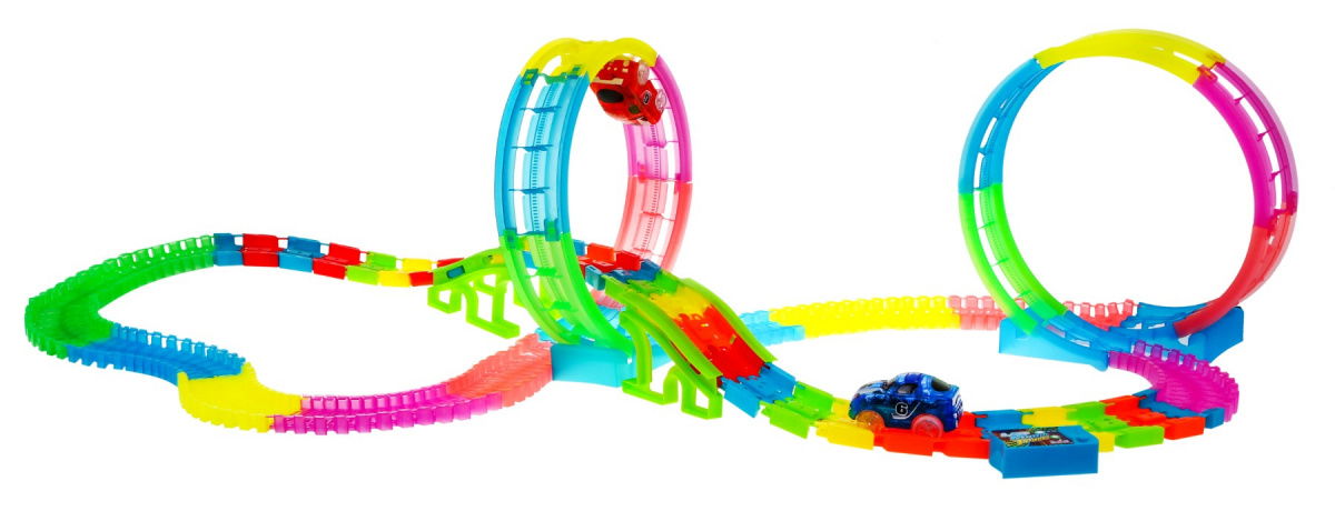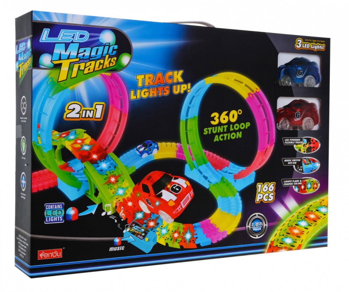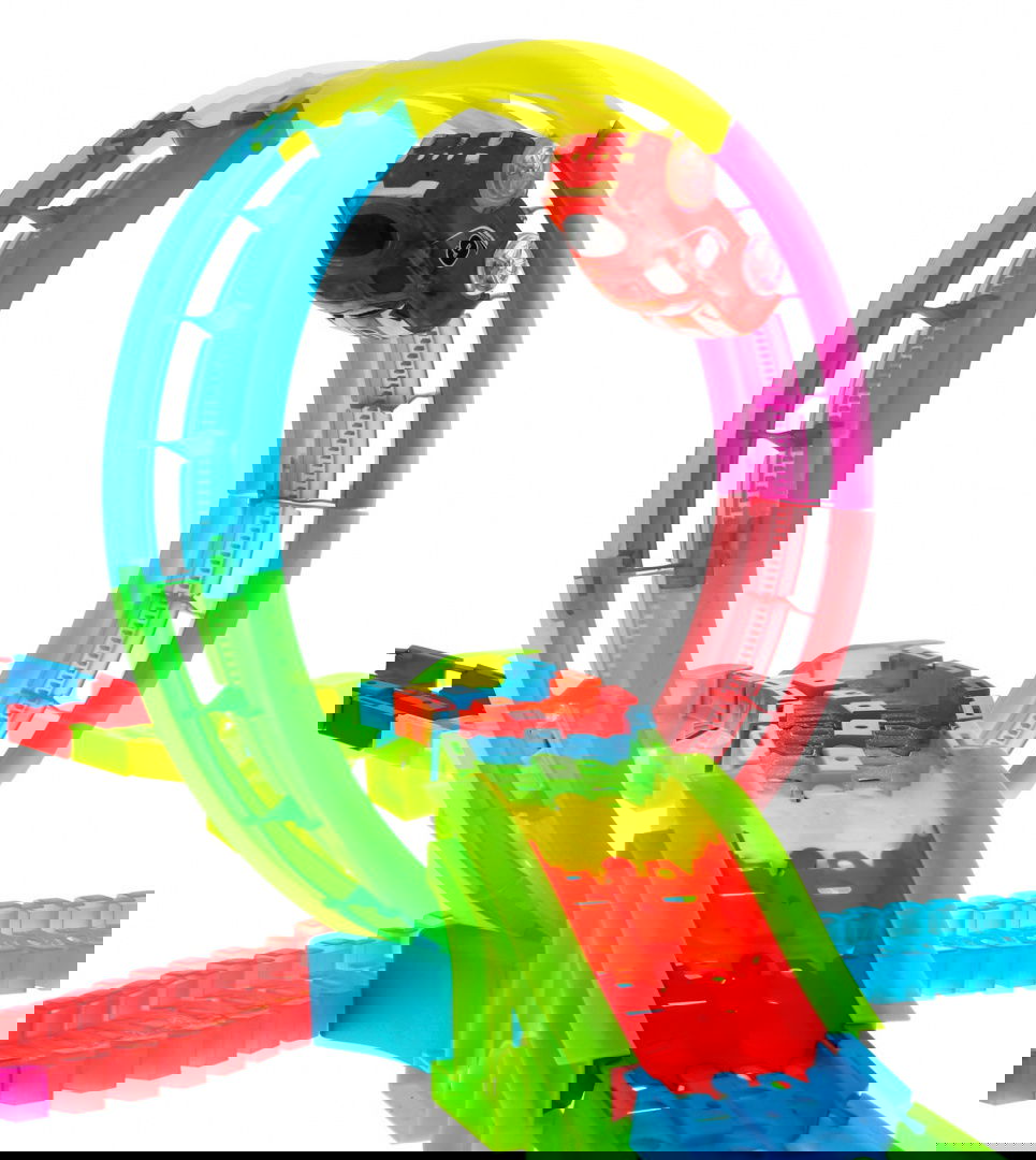 Przygotuj się na niesamowitą przygodę z Mega Tor Świecący W Ciemności 166el.! Ten duży tor z pętlami to idealna propozycja dla dzieci od 3-go roku życia. Dzięki fluorescencyjnemu oświetleniu, panelowi muzycznemu i LED-om, tor i autka stwarzają magiczne efekty w ciemności. W zestawie znajdziesz 166 elementów konstrukcyjnych toru oraz 2 autka. Wymiary to ok. 114 cm x 63 cm x 32 cm dla toru, ok. 9,5 cm x 5 cm x 5 cm dla autka i ok. 52 cm x 36 cm x 8 cm dla opakowania. Nie zapomnij o bateriach typu 2 x AAA do toru i 2 x AAA do każdego z autek. Przygotuj się na niezapomniane chwile zabawy i fascynujące efekty wizualne podczas jazdy po tym ekscytującym torze!