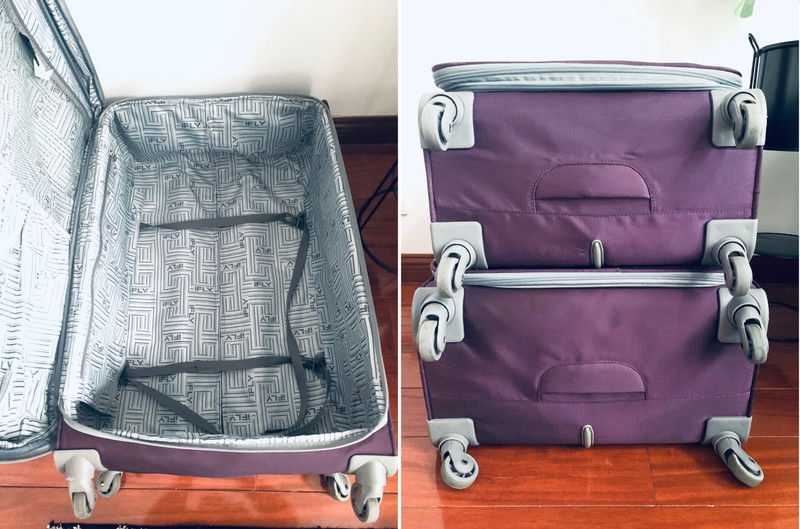 Wewnątrz przegrody jak widać na zdjęciu. Obie torby mają możliwość rozszerzenia, posiadają podwójny suwak. Stan - Idealny !