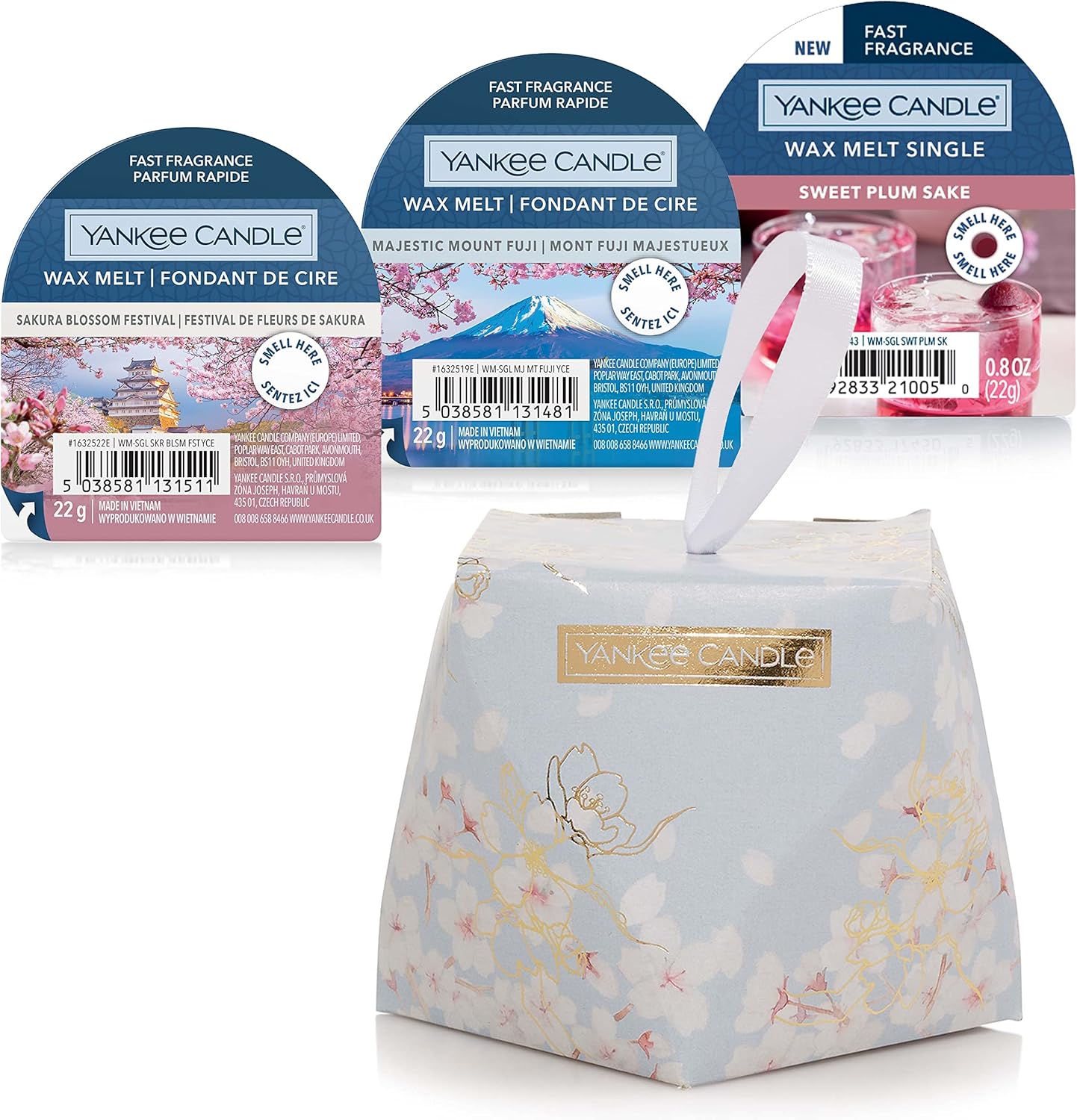 Ten zestaw upominkowy zawiera trzy pachnące świece o zapachach Sakura Blossom Festival, Majestic Mount Fuji i Sweet Plum Sake