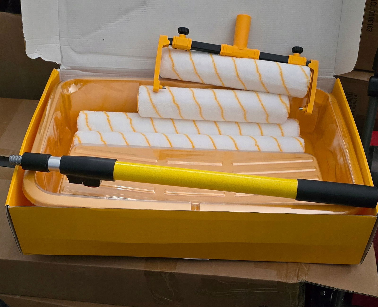 ZESTAW ZAWIERA: , 18-calową kuwetę na farbę i 4 wałki (2 wałki 31 cm długości oraz 2 wałki 46 cm długości) + kijek regulowany do max 1 m długości (Jak na zdjęciach)