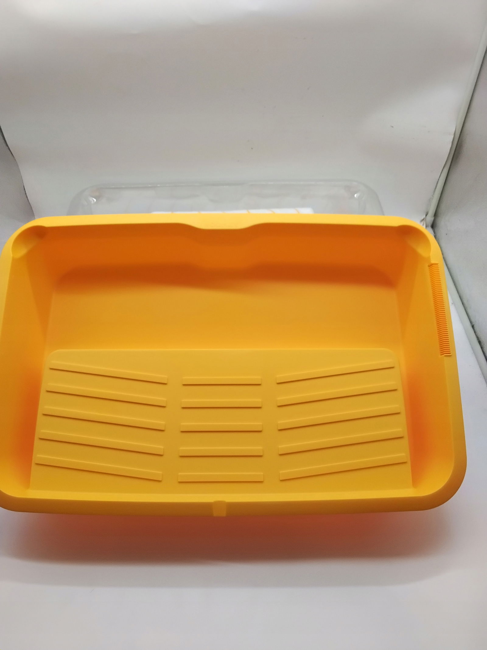 TACKA NA WAŁEK MALARSKI: 18-calowa, duża taca na farbę z trzema 18-calowymi, wyłożonymi tacami bez konieczności czyszczenia, które pomieszczą duże ilości farby, podniesione sekcje wewnątrz tacy ułatwiające zeskrobywanie nadmiaru farby oraz ząbkowane krawędzie tacy ułatwiające wylewanie farby