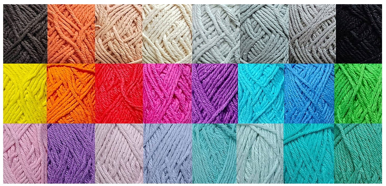 Zestaw włóczek bawełnianych w 24 kolorach. Jest to bardzo miła i przyjemna w dotyku włóczka o długości 25 metrów w motku.