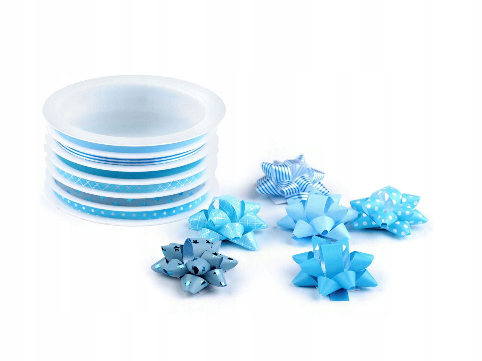 W komplecie znajdziesz szpulę z sześcioma taśmami o różnych wzorach – w paski, kropki, gwiazdki i motywy geometryczne – oraz sześć gotowych rozetek, idealnie dopasowanych do taśm pod względem koloru i stylu. Wstążki można z łatwością skręcać nożyczkami, tworząc efektowne, błyszczące zawijasy.