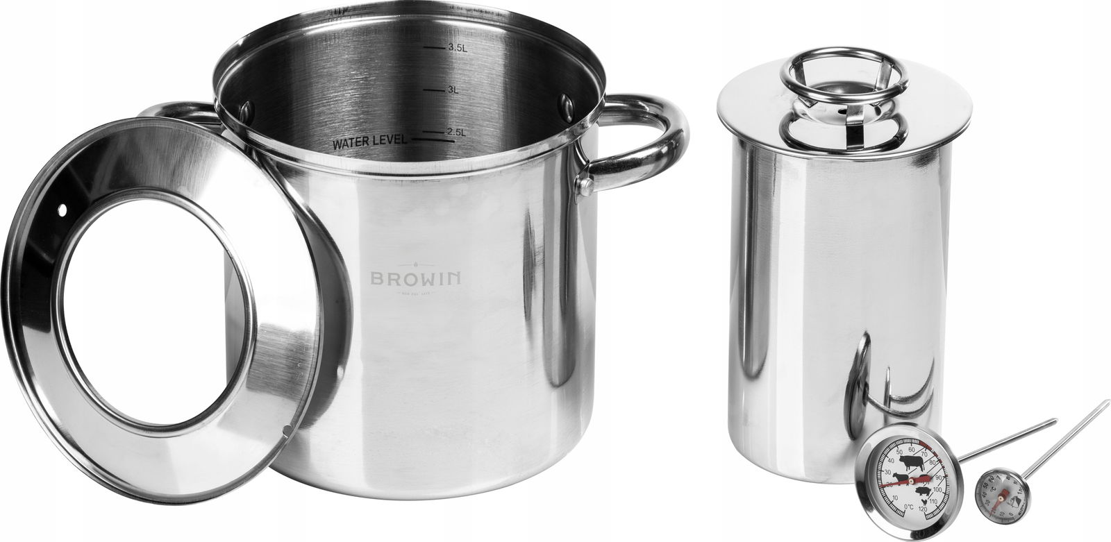 W komplecie znajdują się dwa termometry: pierwszy do kontroli temperatury mięsa w szynkowarze, drugi do pomiaru temperatury wody.