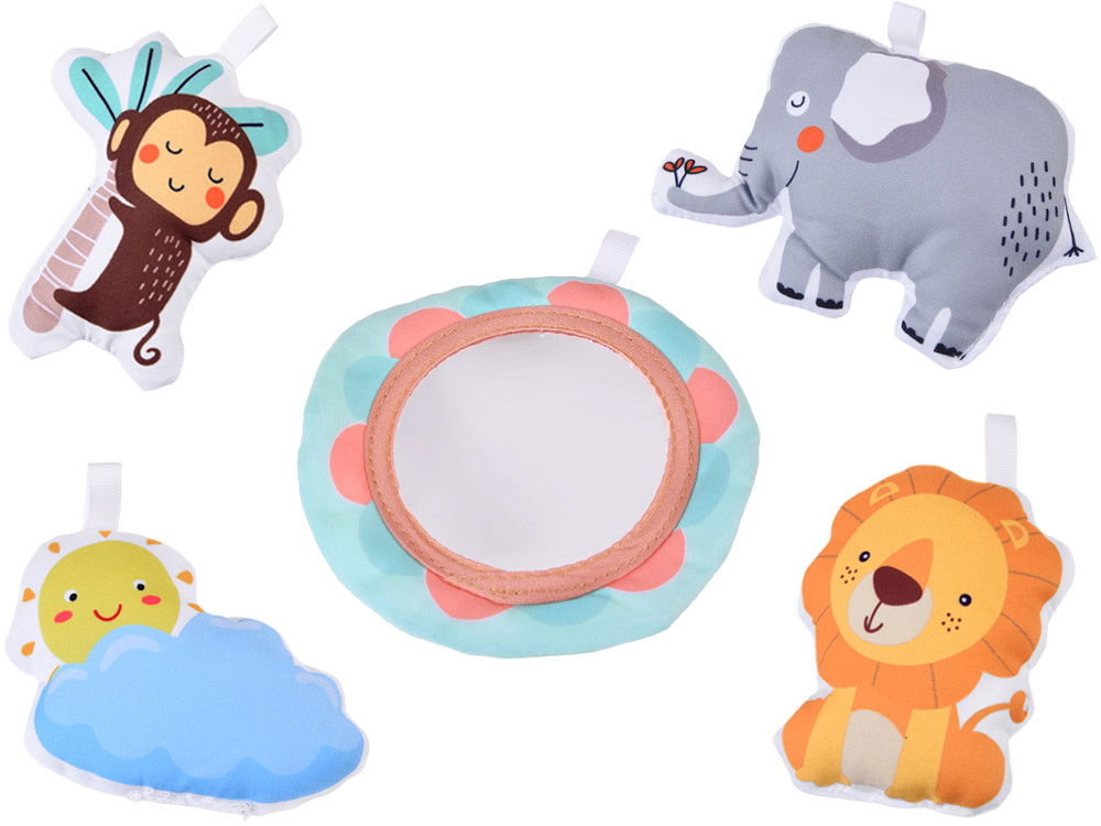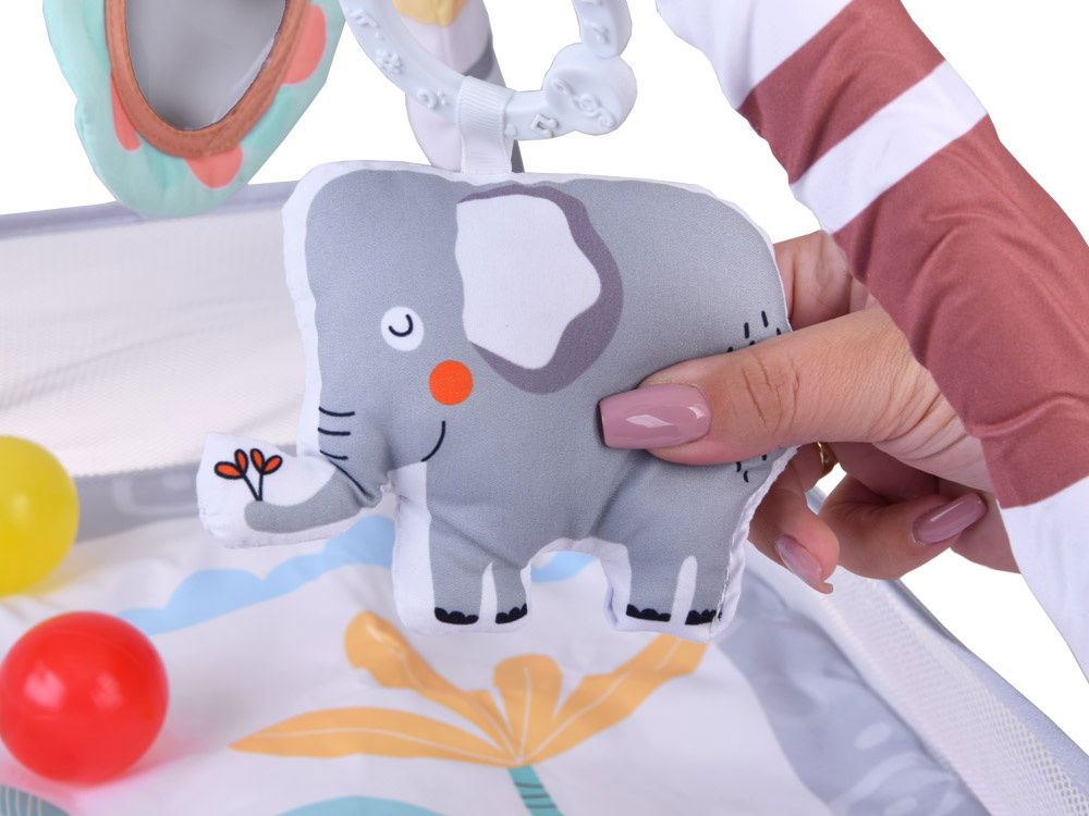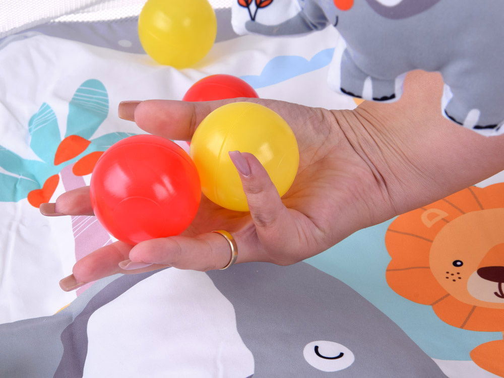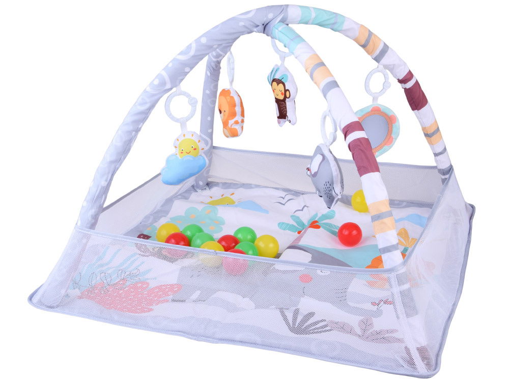 W zestawie znajduje się miękka mata edukacyjna, dwa giętkie pałąki, kolorowe piłeczki do zabawy oraz różnorodne zawieszki i zabawki, takie jak lusterko, słoneczko z chmurką oraz zwierzątka.
