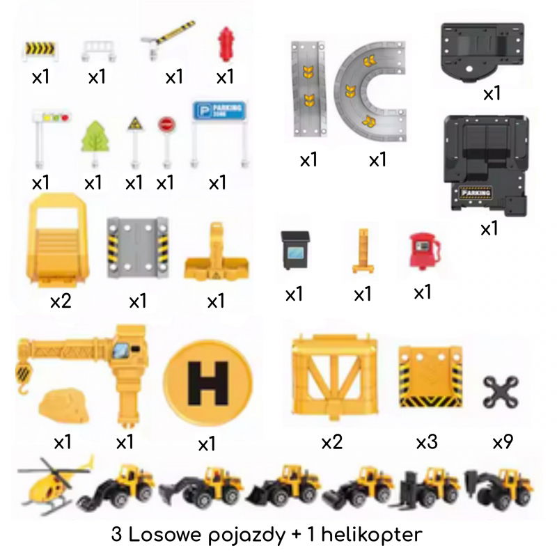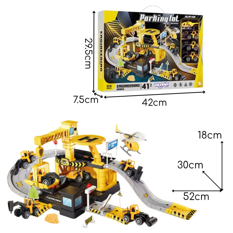 Zapewnij swojemu dziecku niezapomnianą rozrywkę z dwupoziomowym parkingiem firmy budowlanej Woopie! Ten fantastyczny zestaw tematyczny zawiera aż 41 elementów, w tym metalowe auta budowlane i helikopter, które pozwolą małemu konstruktorowi stworzyć własny plac budowy w swoim pokoju. Parking wyposażony jest w rampy, lądowisko dla helikoptera, dźwig z funkcją windy oraz realistyczne detale takie jak stacja benzynowa czy sygnalizacja świetlna. Zabawka rozwija wyobraźnię, koordynację ruchową, logiczne myślenie oraz umiejętność rozpoznawania ról społecznych. Solidna konstrukcja z wytrzymałego plastiku sprawia, że jest bezpieczna dla dzieci. Wymiary produktu to 52 x 30 x 18 cm, a opakowania 42 x 29.5 x 7.5 cm. Pozwól dziecku czerpać radość i naukę z tej ekscytującej zabawki!