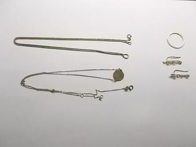 Zestaw złotej biżuterii, w skład którego wchodzi: - 1x łańcuszek, próba 333, waga 1,68 g - 1x łańcuszek, próba 333, waga 2,43 g - 1x obrączka z kamieniami, rozmiar 10, próba 585, waga 1,09 g - 1x para kolczyków z kamieniami, próba 585, waga 1,64 g