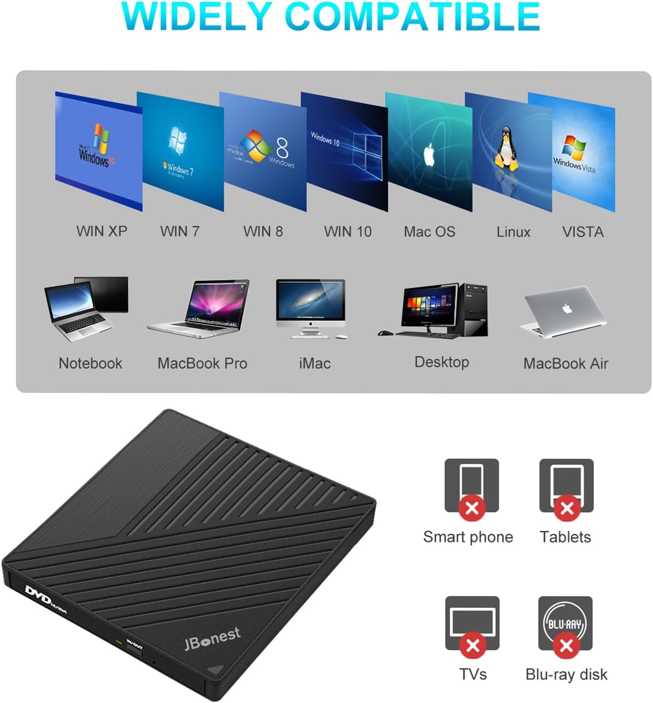 Plug & Play: Łatwy w obsłudze, ciesz się życiem łatwiej. Napęd DVD nie wymaga dodatkowego sterownika. Podłącz zewnętrzny napęd DVD bezpośrednio do portu USB lub typu C z komputera. Wtedy sterownik DVD zostanie rozpoznany i rozpocznie się Twoja szczęśliwa podróż. Zapewnia szybsze i płynniejsze wrażenia podczas instalowania filmów, oprogramowania. Upewnij się, że odtwarzacz Windows Media Player obsługuje wyświetlane formaty multimediów.