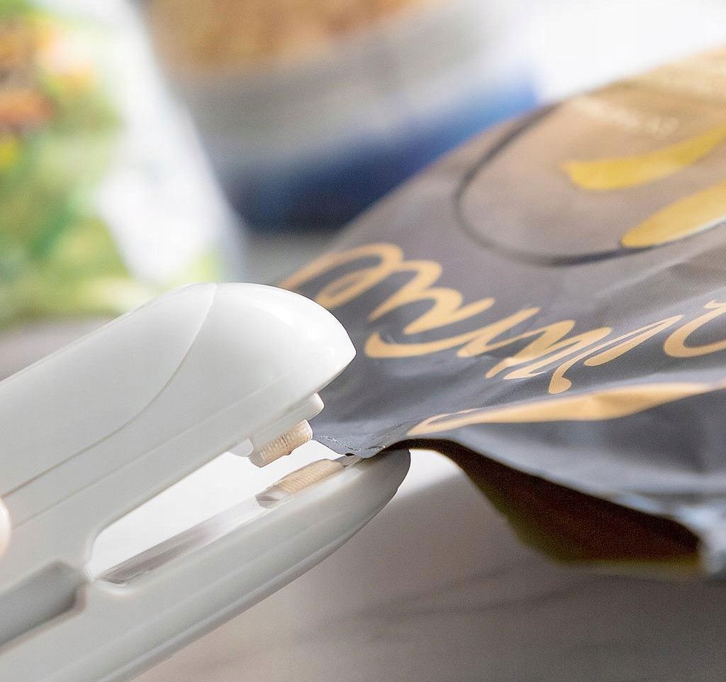 Wbudowany wewnątrz obcinacz jest idealny do łatwego cięcia i otwierania woreczków. Wystarczy umieścić i wcisnąć koniec worka pomiędzy dwie płytki tnące i powoli przesuwać, aby przeciąć pożądaną powierzchnię. Pozwala również na odcięcie nadmiaru worka po zgrzaniu.
