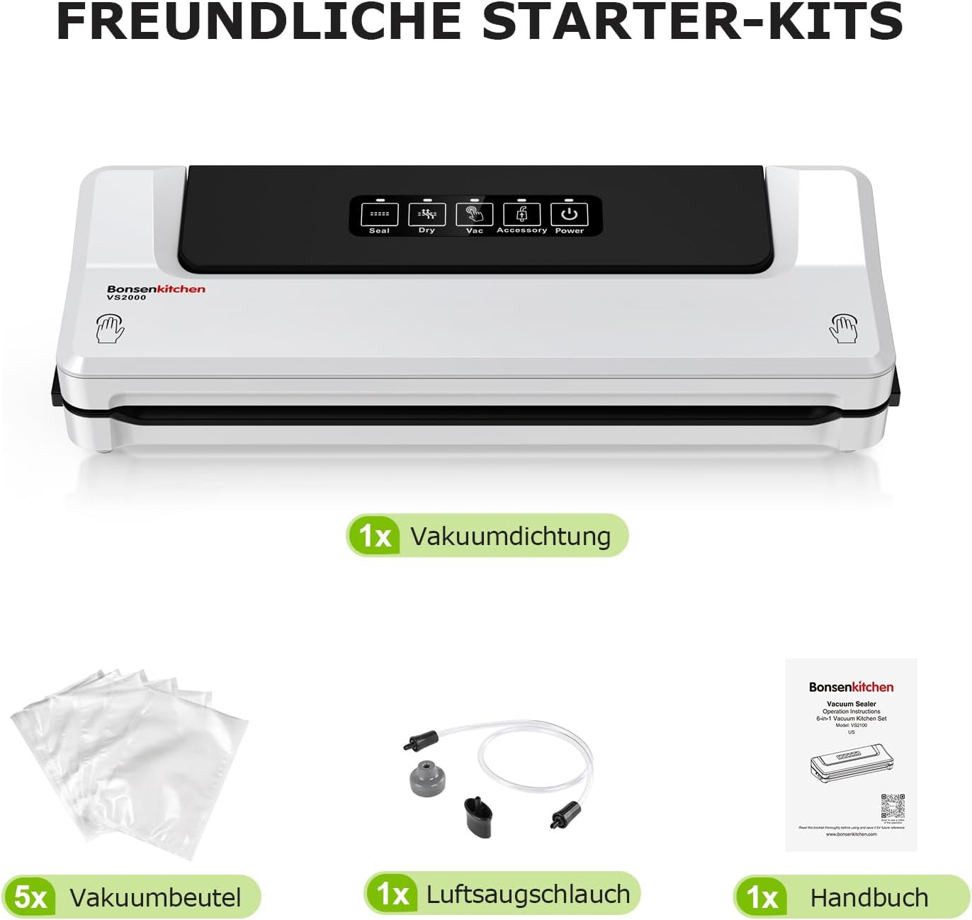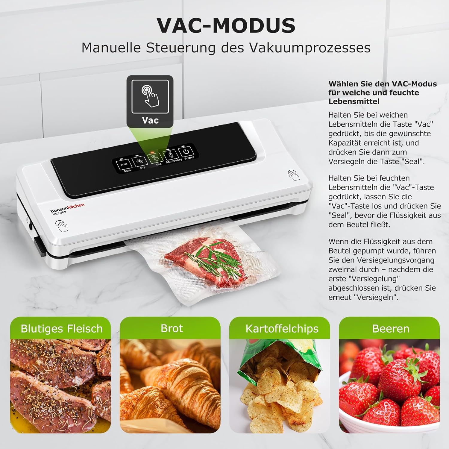 Zgrzewarka próżniowa Bonsenkitchen, zgrzewarka foliowa do gotowania metodą sous-vide, żywność pozostaje świeża do 8 razy dłużej, tryby suchy i wilgotny, w zestawie 5 worków próżniowych