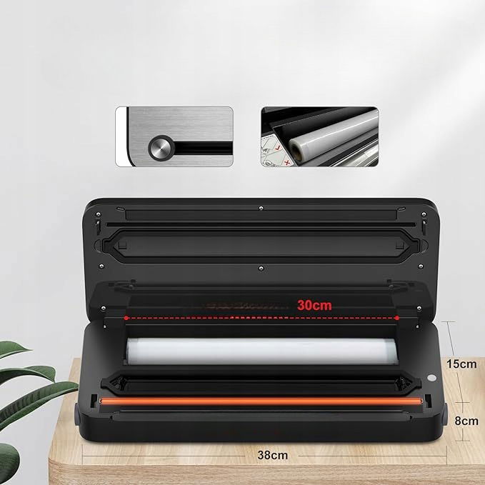 Maksymalna długość zgrzewania wynosi 30 cm. Wszystkie worki lub rolki próżniowe o szerokości mniejszej niż 30 cm można zgrzewać. Dzięki wbudowanej obcinarce w ciągu kilku sekund wyprodukujesz worki próżniowe o określonym rozmiarze. Konstrukcja do przechowywania worków na rolkach sprawia, że zgrzewarka próżniowa jest łatwa w codziennym użyciu.