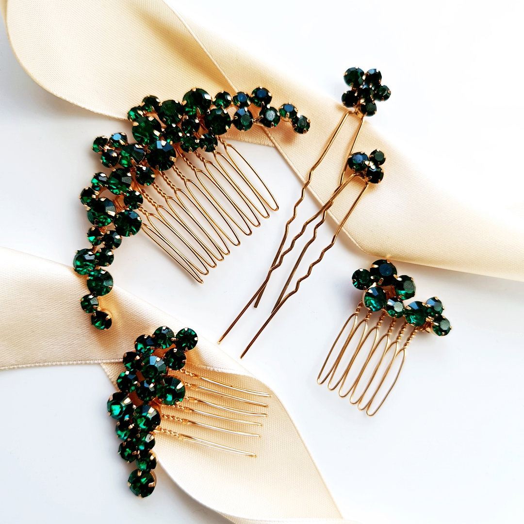 Piękny i elegancki zestaw zielonych ozdób do włosów w złotej oprawie z powodzeniem doda blasku efektownej fryzurze ślubnej i nie tylko. Komplet składa się z trzech grzebyków o różnych wielkościach oraz dwóch szpilek, które pięknie się uzupełniają. Z tymi ozdobami możesz spokojnie budować efekt używając tylko jednego grzebyka, lub stworzyć zjawiskową konstrukcję przy użyciu całego zestawu.