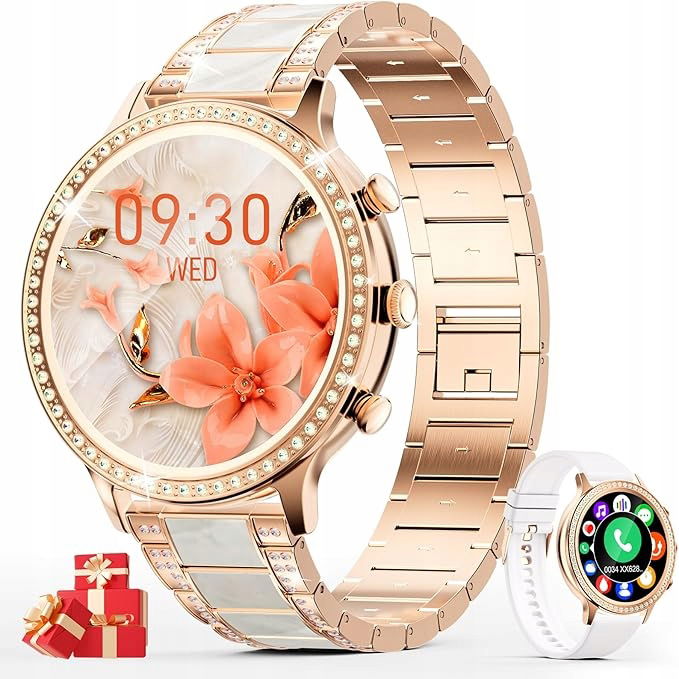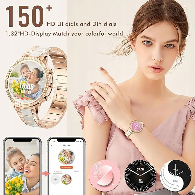 - 【Twój zegarek, Twój styl】Klasyczne wzornictwo, opalizujący i elegancki jednocześnie. Pełny ekran dotykowy 1,32 cala jest pokryty cyrkonią metalową ramą. Pasująca bransoletka z powłoką z cyrkonii sprawia, że cały zegarek jest spokojny i elegancki, światło i cień dalej promieniują urokiem. Do dyspozycji jest ponad 150 bezpłatnych cyferblatów. Możesz dopasować swój ulubiony obraz. każdy nastrój lub każda impreza - Wybierz okazję.
