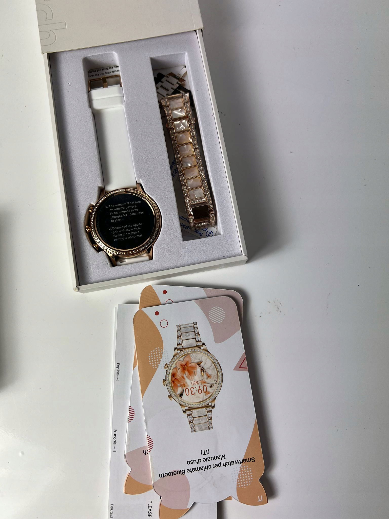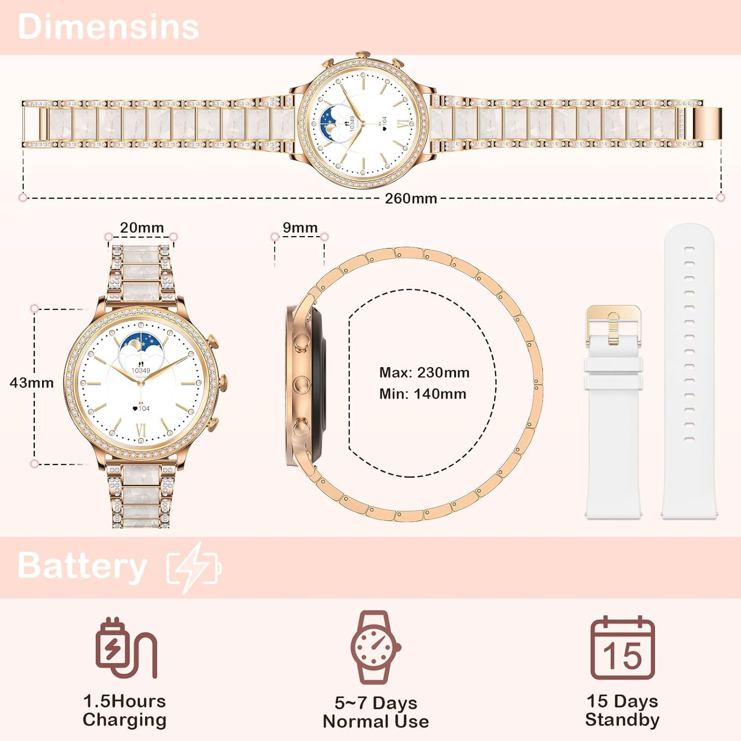 - 【Smartwatch do systemu Android IOS】Smartwatch dla kobiet jest kompatybilny z większością smartfonów z systemem Android 4.4 i iOS 8.4 lub nowszym. Pojemność akumulatora 230 mAh, ładowanie trwa tylko 2 godziny, może być używany przez 3-4 dni, 10 dni w trybie czuwania.