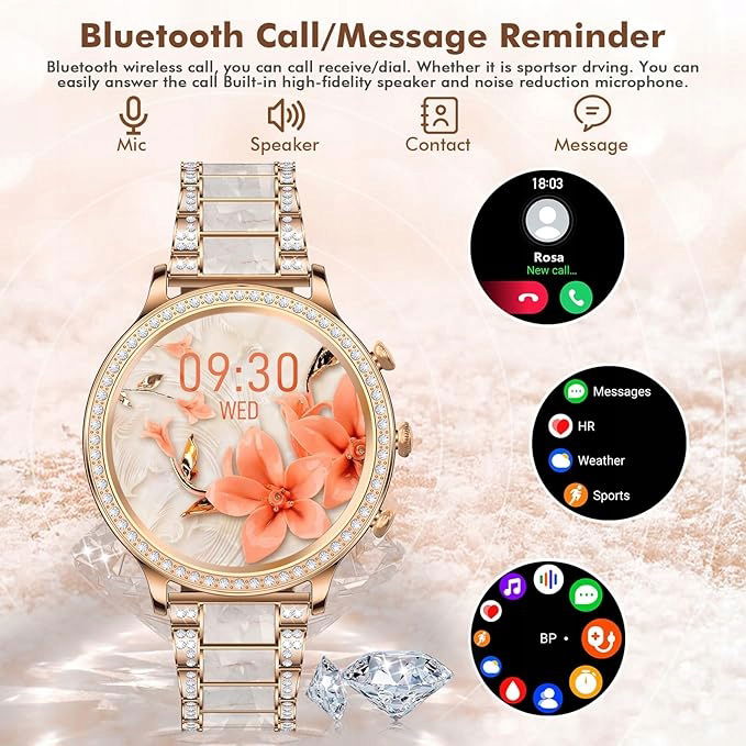 - 【Smartwatch】Możesz wykonywać lub odbierać połączenia telefoniczne bezpośrednio na smartwatchu. Ponadto możesz odtwarzać muzykę z kompatybilnego telefonu komórkowego na zegarku. Smartwatche wykorzystują wersję BLE5.0, szybsze i bardziej stabilne połączenie. Można również odbierać wiadomości SMS i SNS, takie jak Facebook, Twitter, Whats App, Skype, Ins itd. Ten damski smartwatch w kolorze różowego złota może również sterować asystentem głosowym sztucznej inteligencji Twojego telefonu, np. Siri, Bixby, Google.