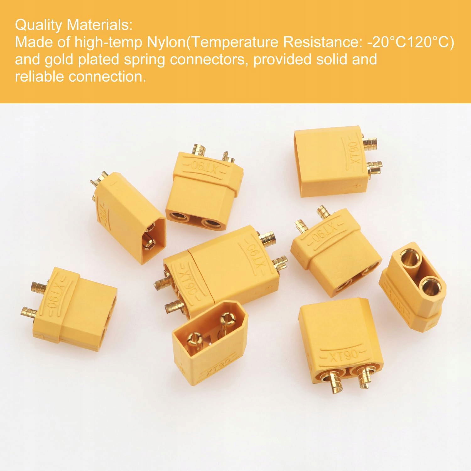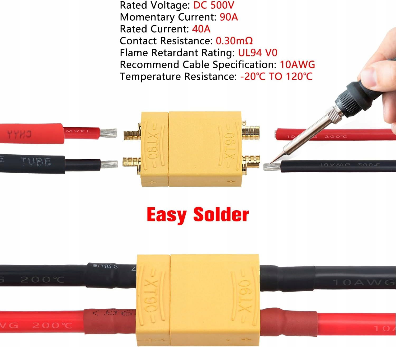 Dzięki wysokiemu napięciu znamionowemu 500V i prądowi chwilowemu 90A, złącza XT90 doskonale sprawdzą się w wymagających projektach. Zastosowanie kabla 10AWG podnosi ich wydajność.