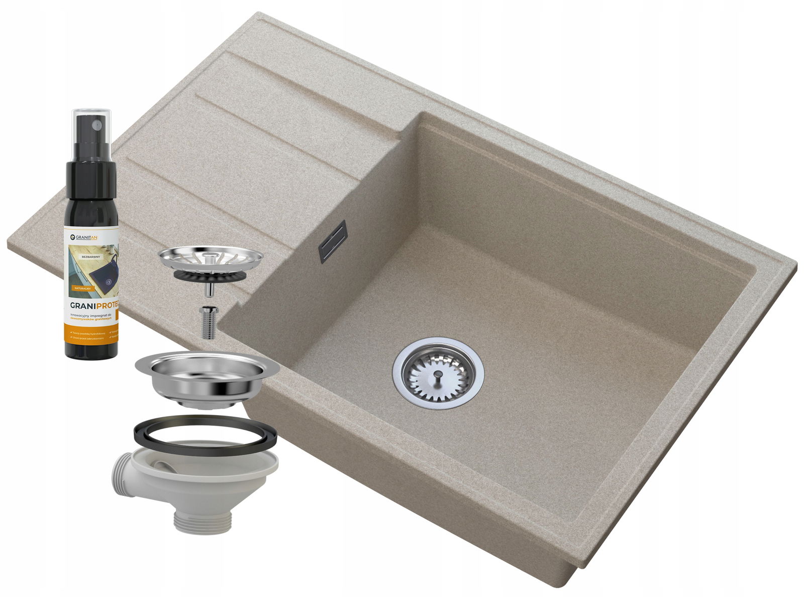 ZLEW GRANITOWY BEŻOWY OCIEKACZ SYFON CHROM LOUIS