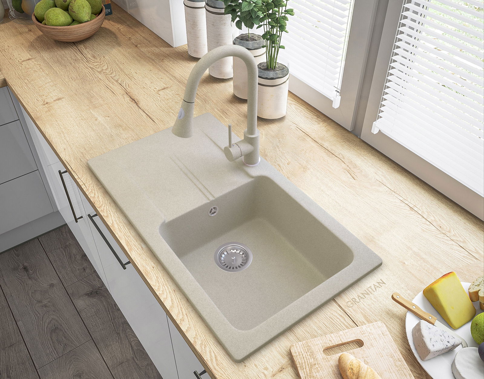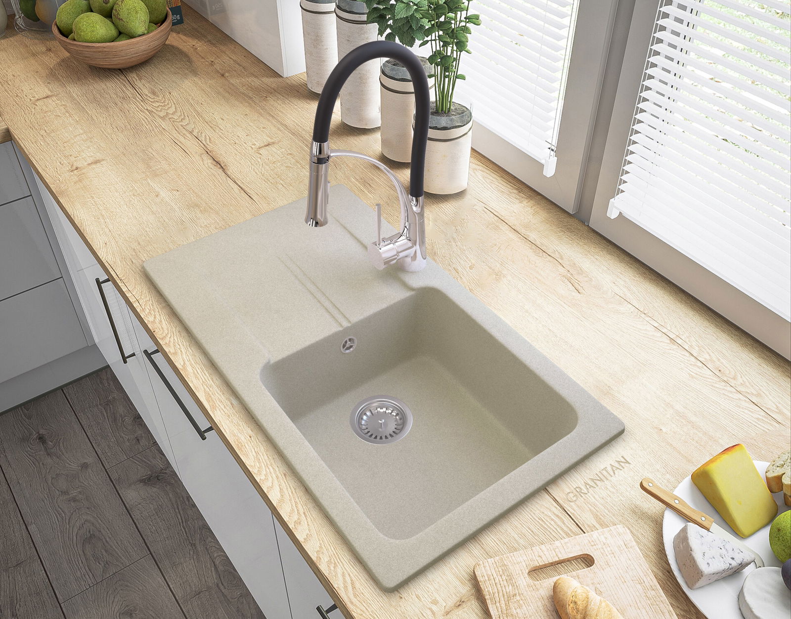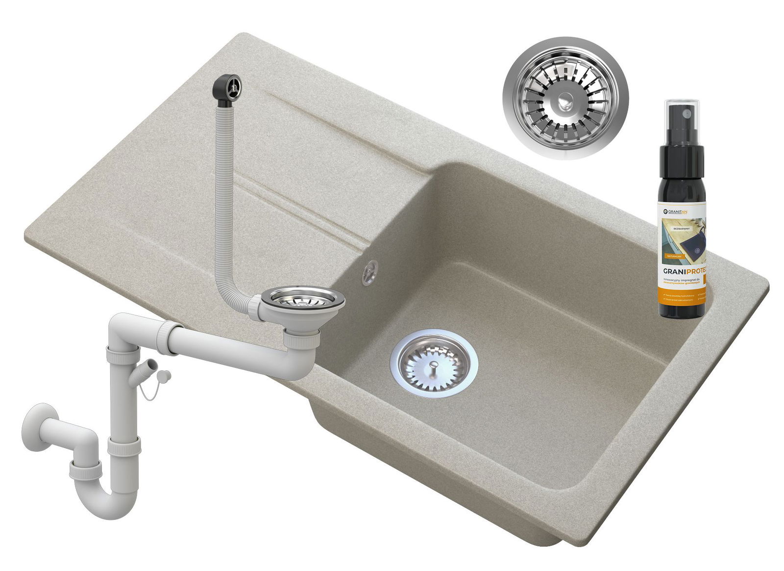ZLEW GRANITOWY Z OCIEKACZEM BEŻ SYFON CHROM TASOS