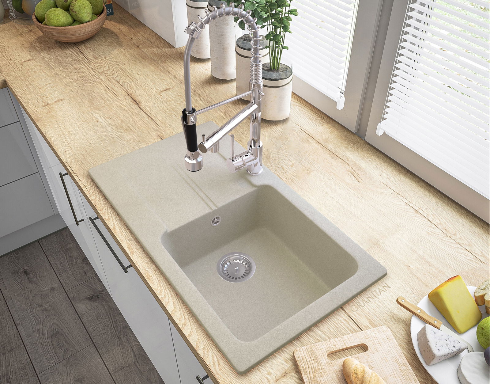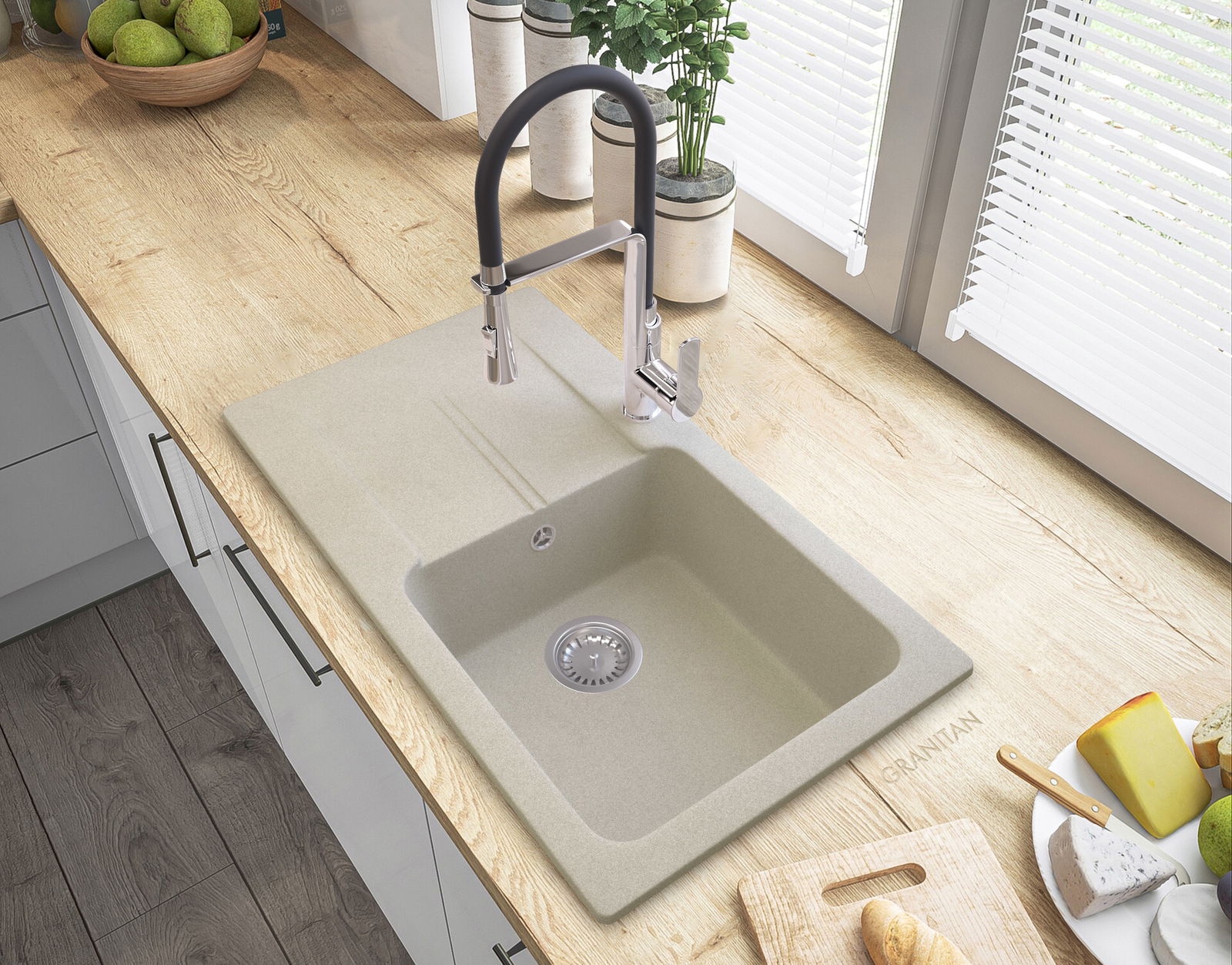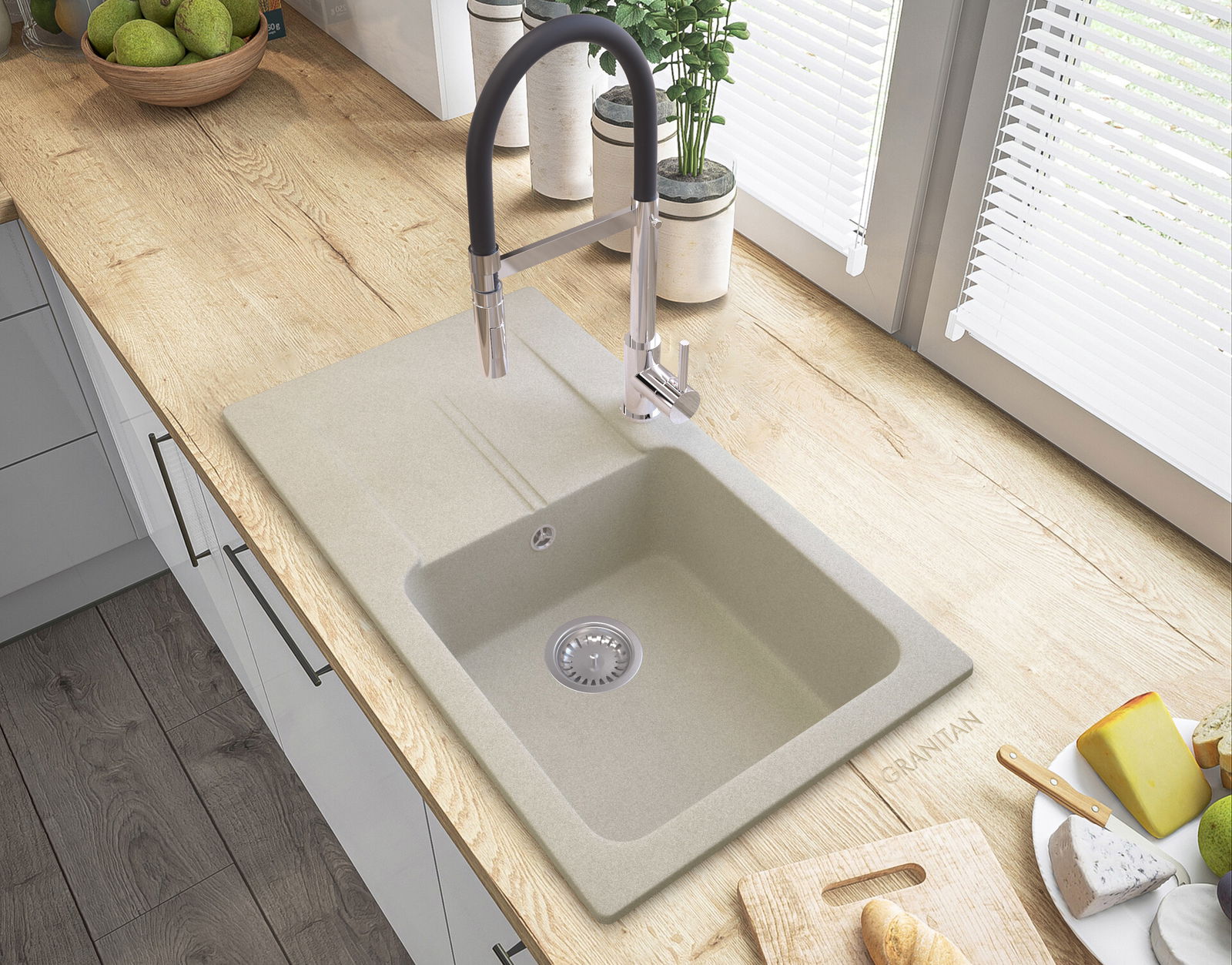 ZLEW GRANITOWY Z OCIEKACZEM BEŻ SYFON CHROM TASOS