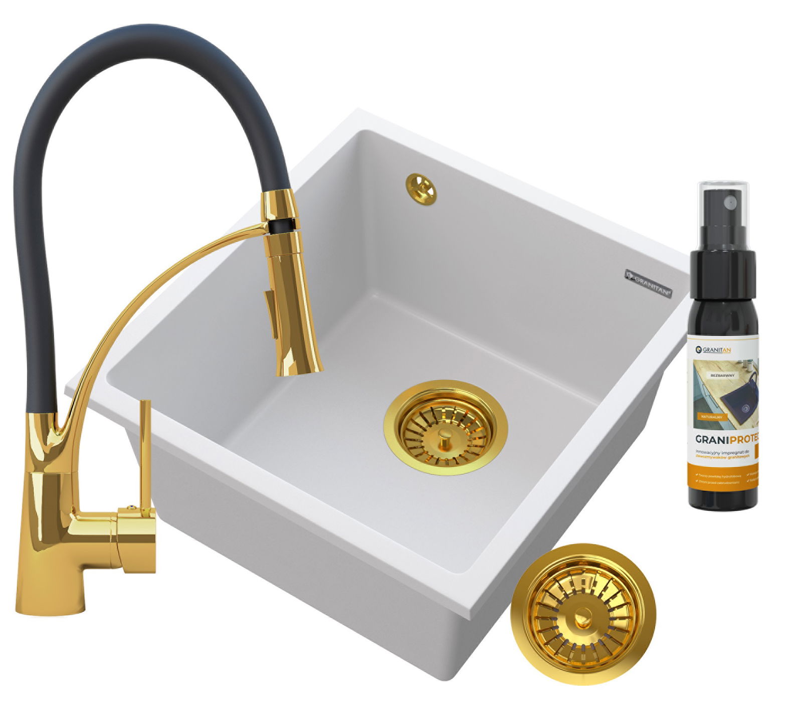 ZLEW PODWIESZANY BIAŁY GRANIT ZESTAW ZŁOTY MINI45