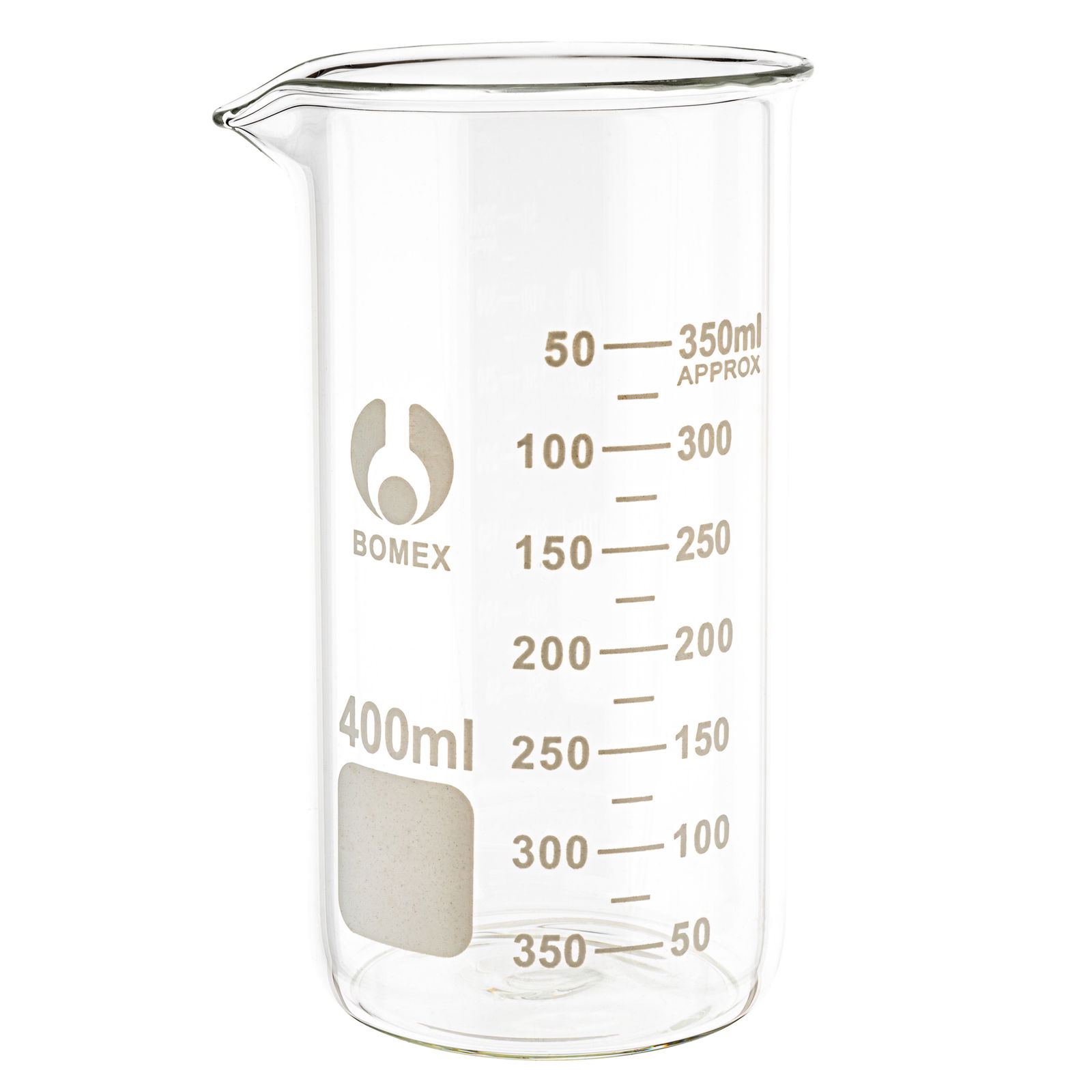 Zlewka laboratoryjna szklana wysoka 400 ml Boro 3.3 ze skalą polem opisowym