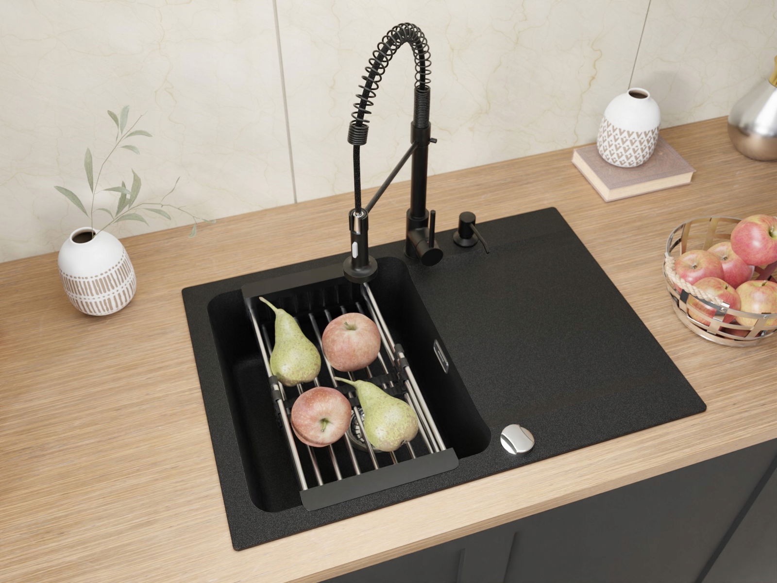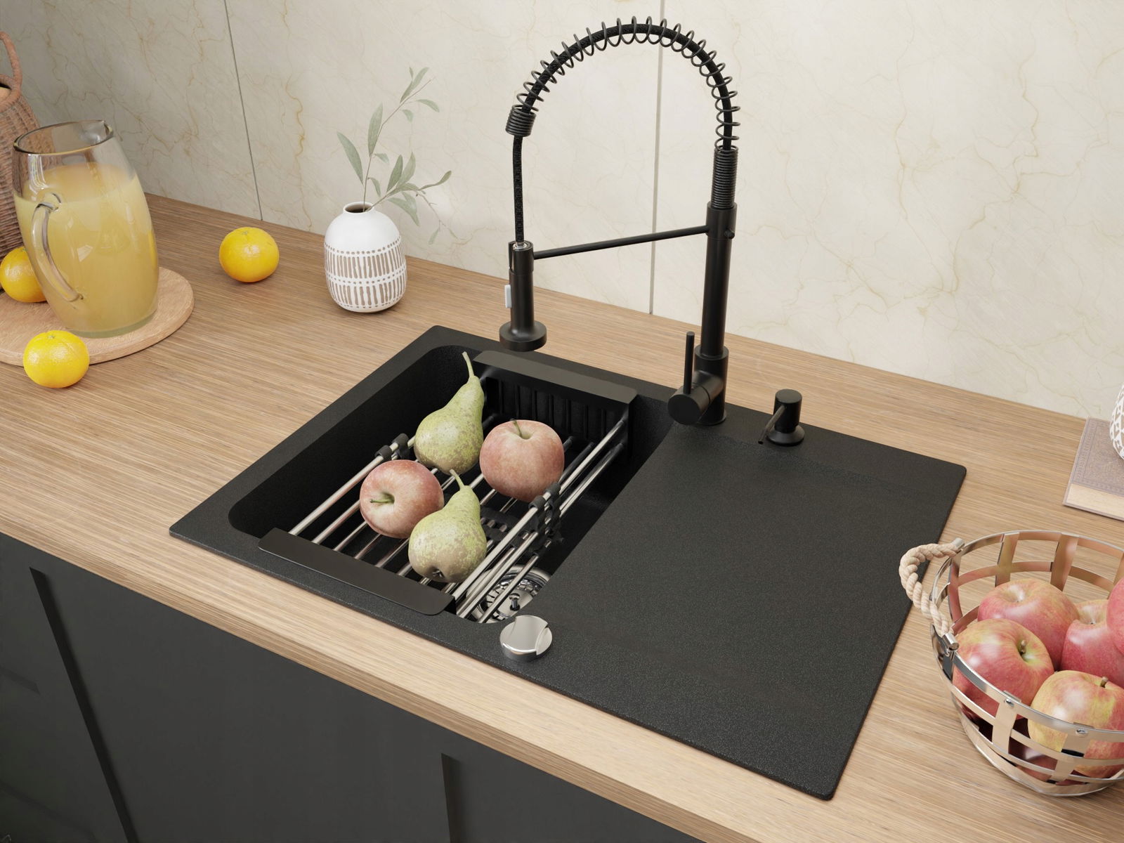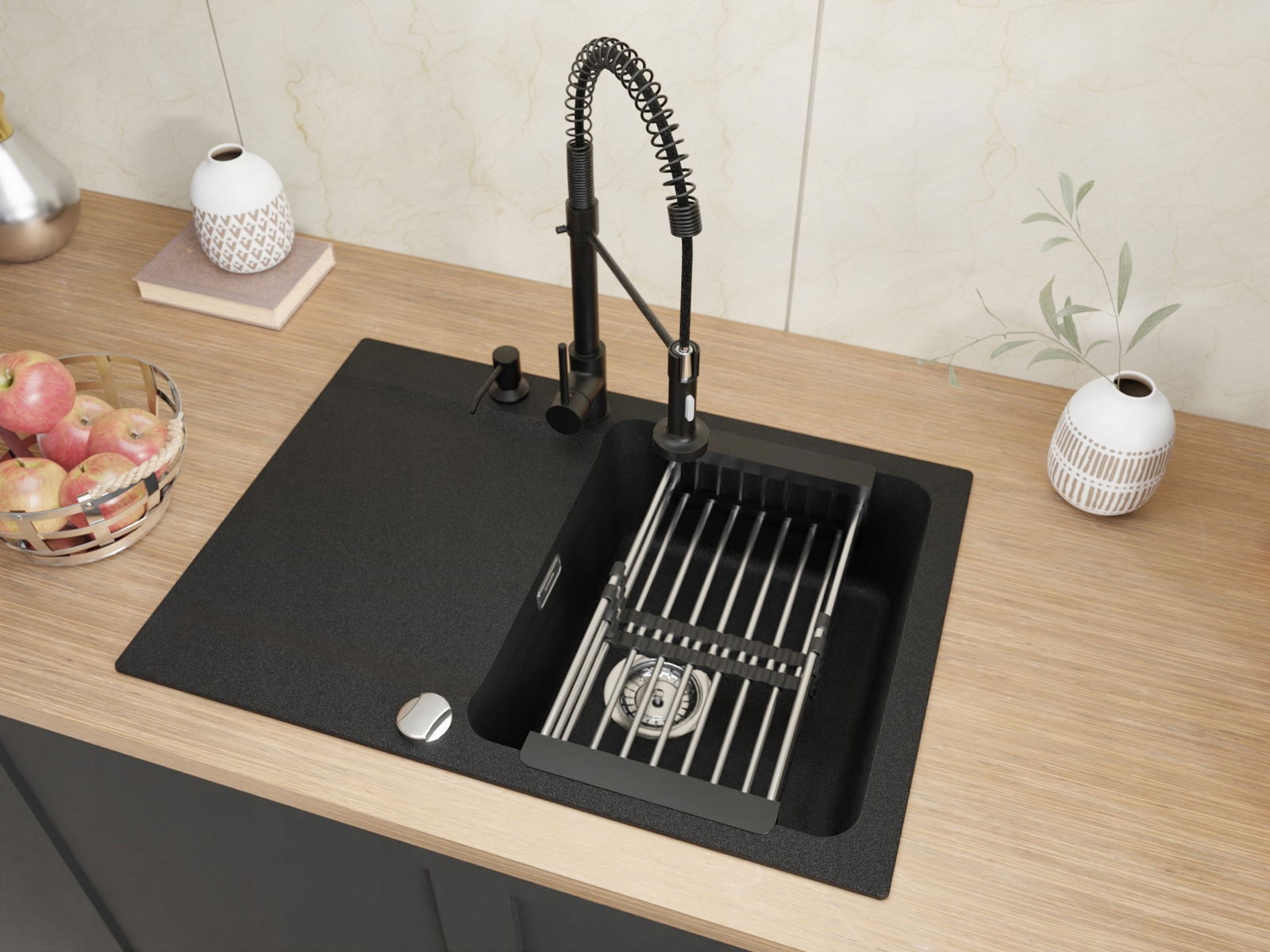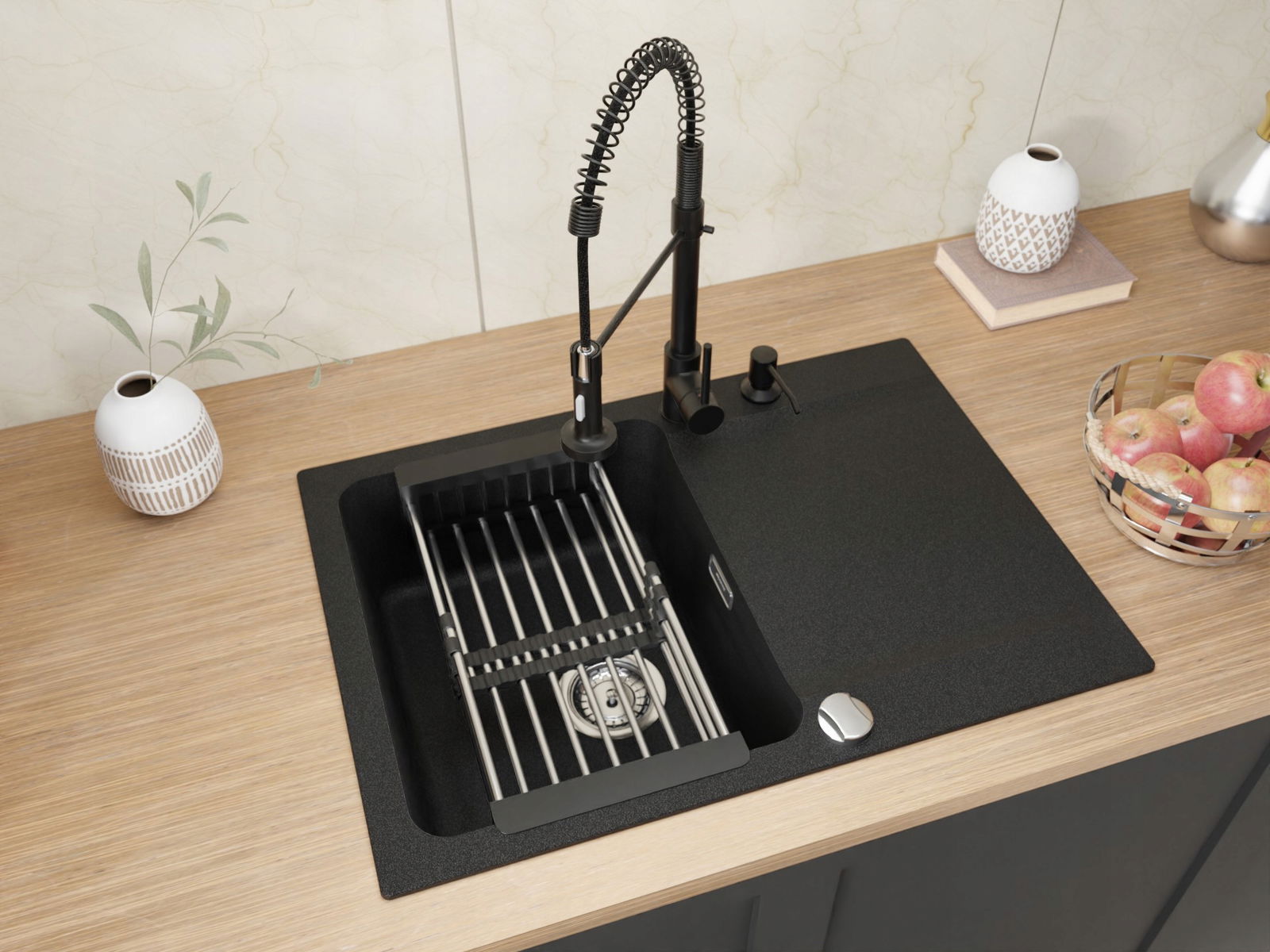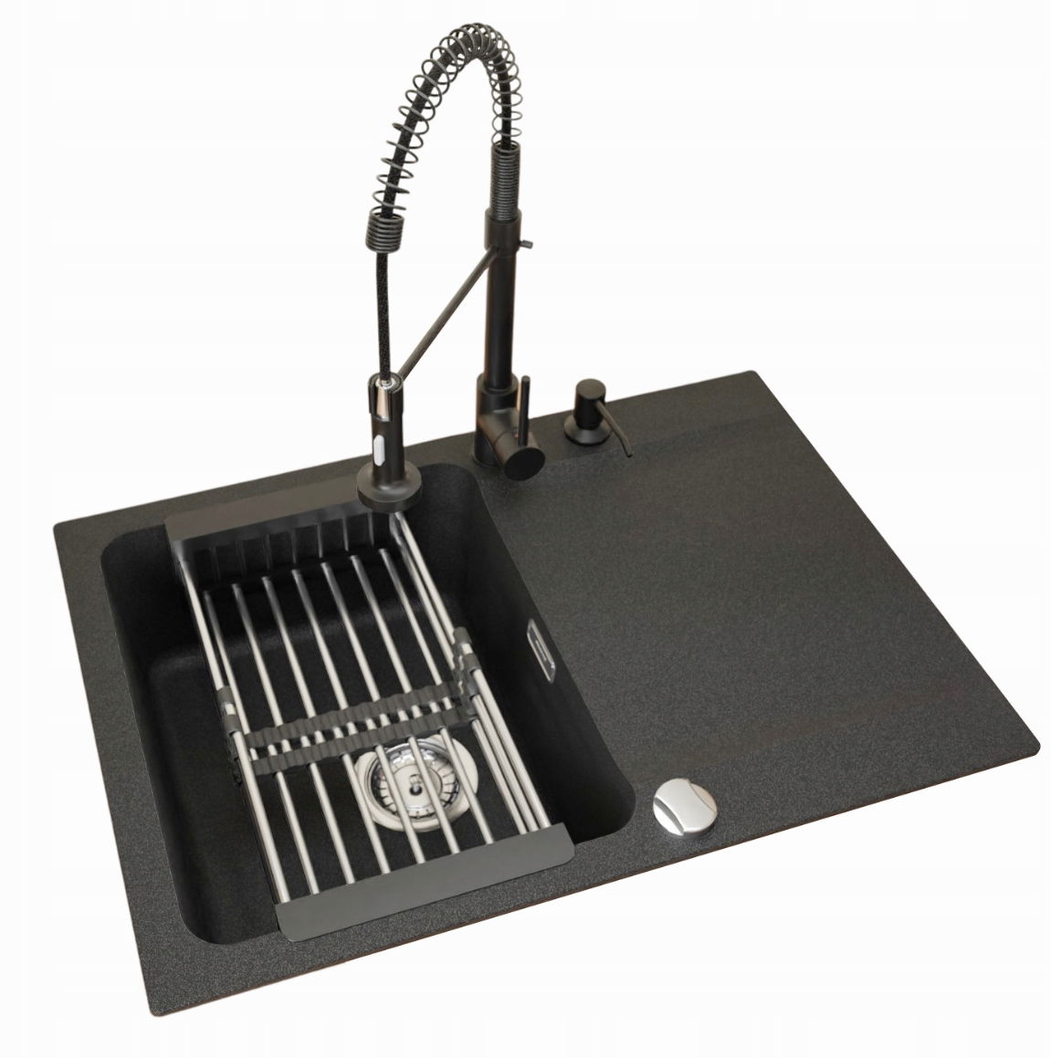 ✅Zawartość zestawu: zlewozmywak, bateria, syfon, rury, zaciski mocujące, dozownik, ociekarka teleskopowa
