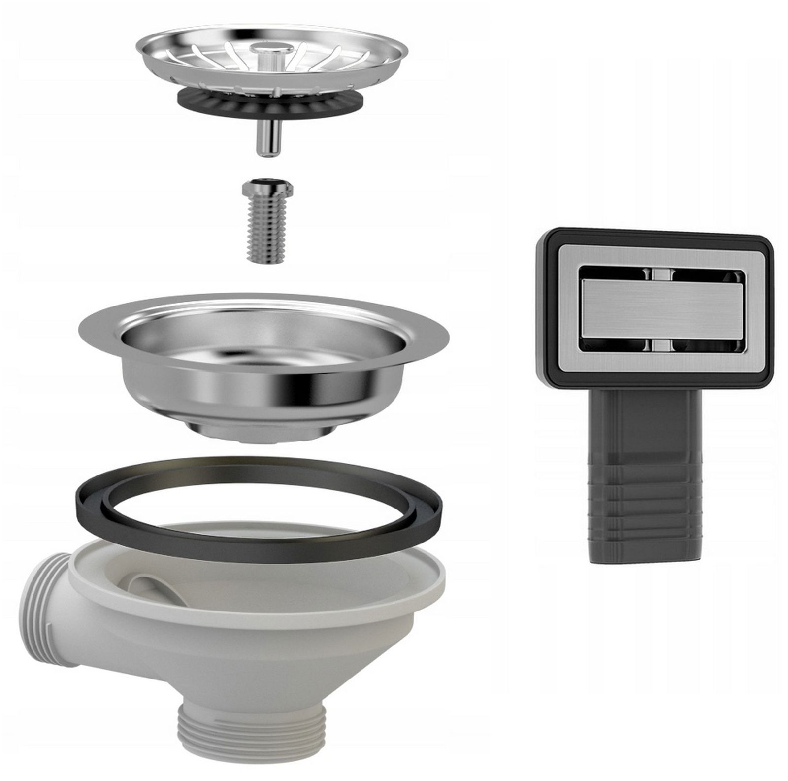 Minimalistyczną formę zlewozmywaka przełamuje syfon z prostokątnym przelewem, który dodatkowo podkreśla modernistycznyc charakter zlewu.