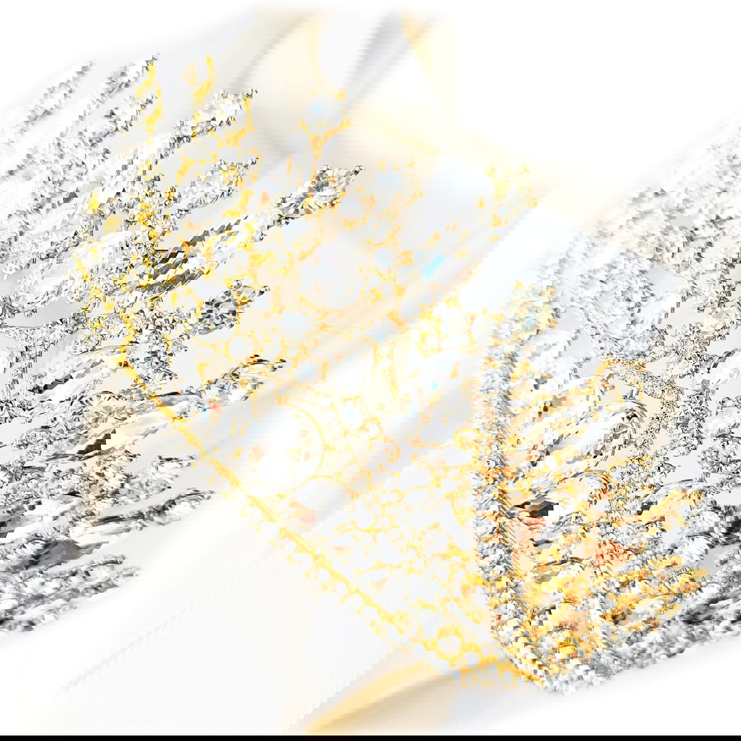 Z tą złotą efektowną tiarą będziesz się odróżniać od innych. Diadem wysadzany jest niezliczoną ilością cyrkonii, które oddają niesamowity blask. Zdecydowanie jest to ozdoba dla królowej przyjęcia.