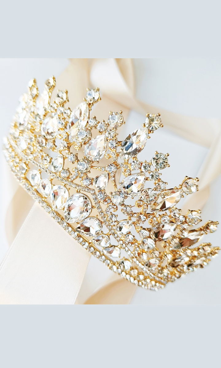 złota duża elegancka korona błyszcząca ŚLUB gala pokaz FASHION ozdoba głowę