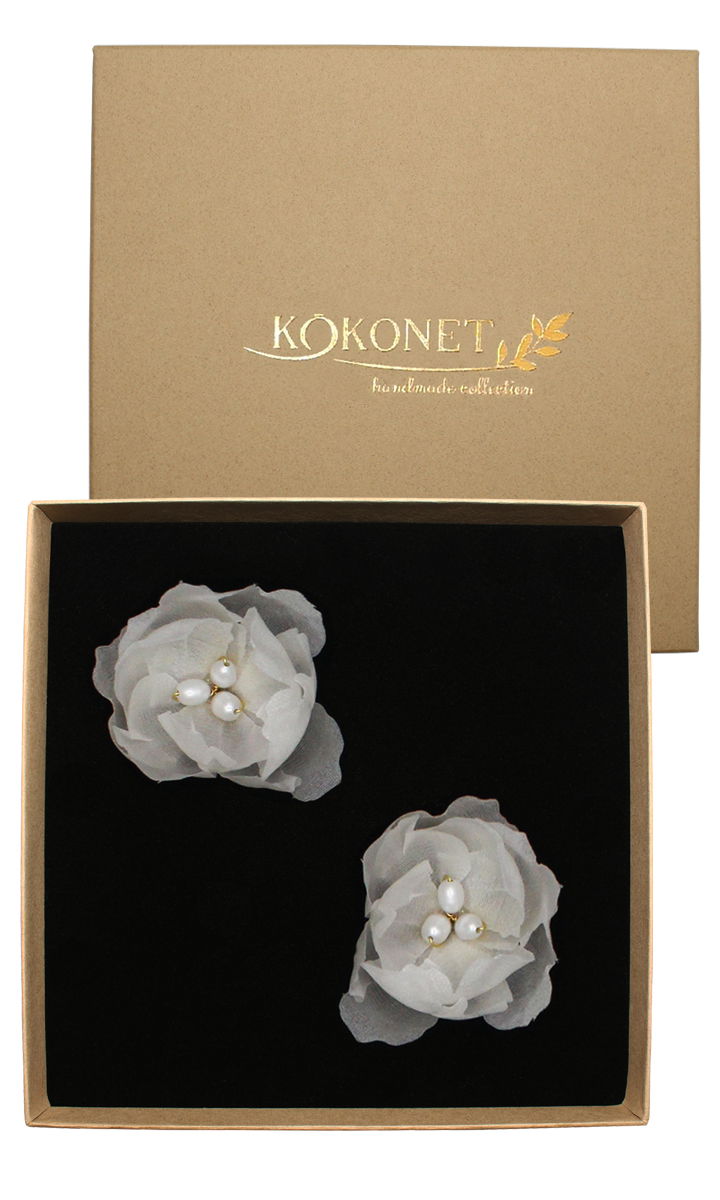 Kolczyki wykonane ręcznie ze stali nierdzewnej w towarzystwie pereł hodowlanych oraz ręcznie formowanego naturalnego jedwabiu zapakowane w eleganckie pudełko