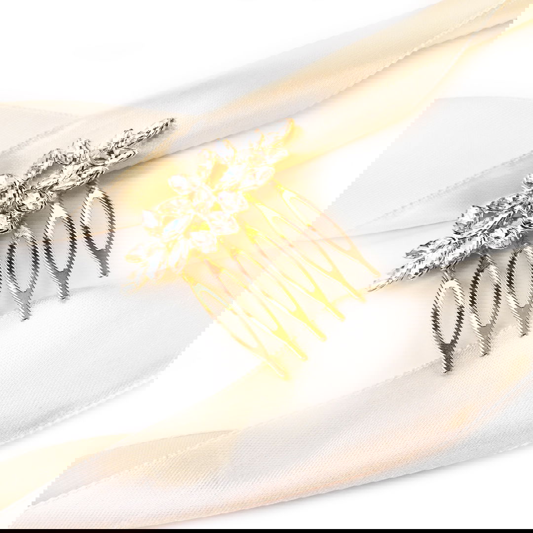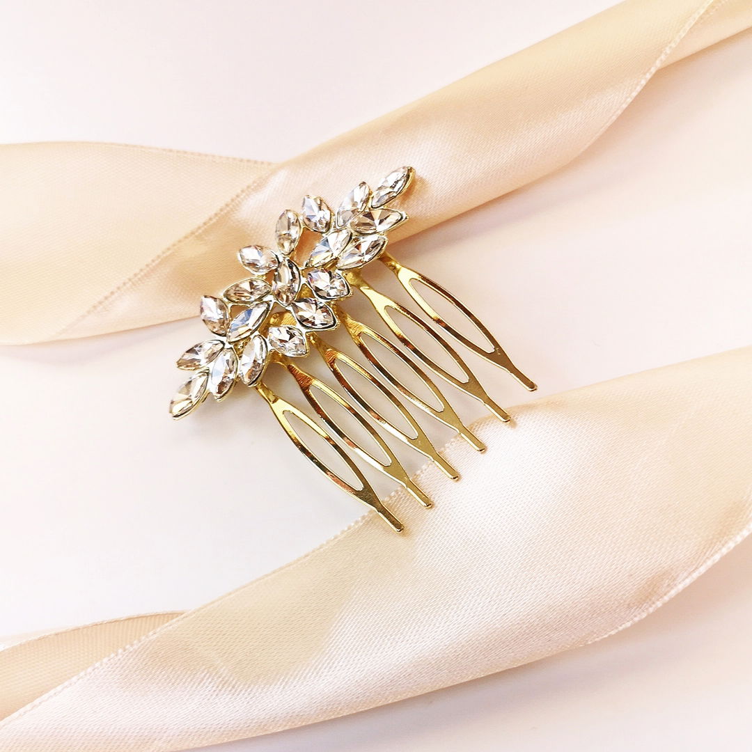 Elegancki i delikatny grzebyk ślubny w kolorze złotym wybierze z pewnością Panna Młoda szukająca dodatków klasycznych, eleganckich i stylowych. Ta ozdoba do włosów doda Twojej fryzurze blasku. Z powodzeniem wepnij ten stroik do koka, lub lekko upiętych włosów.