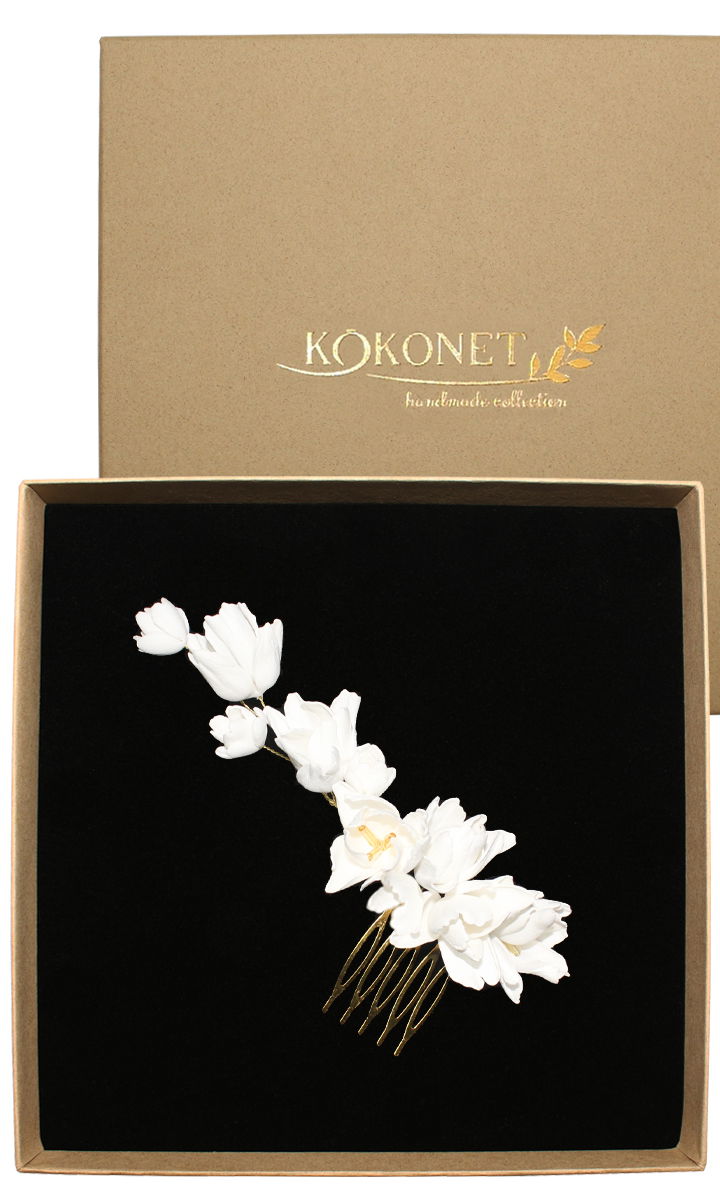ZŁOTY grzebyk z kwiatkami spinka do włosów ślubna BIAŁA stylowa robiona