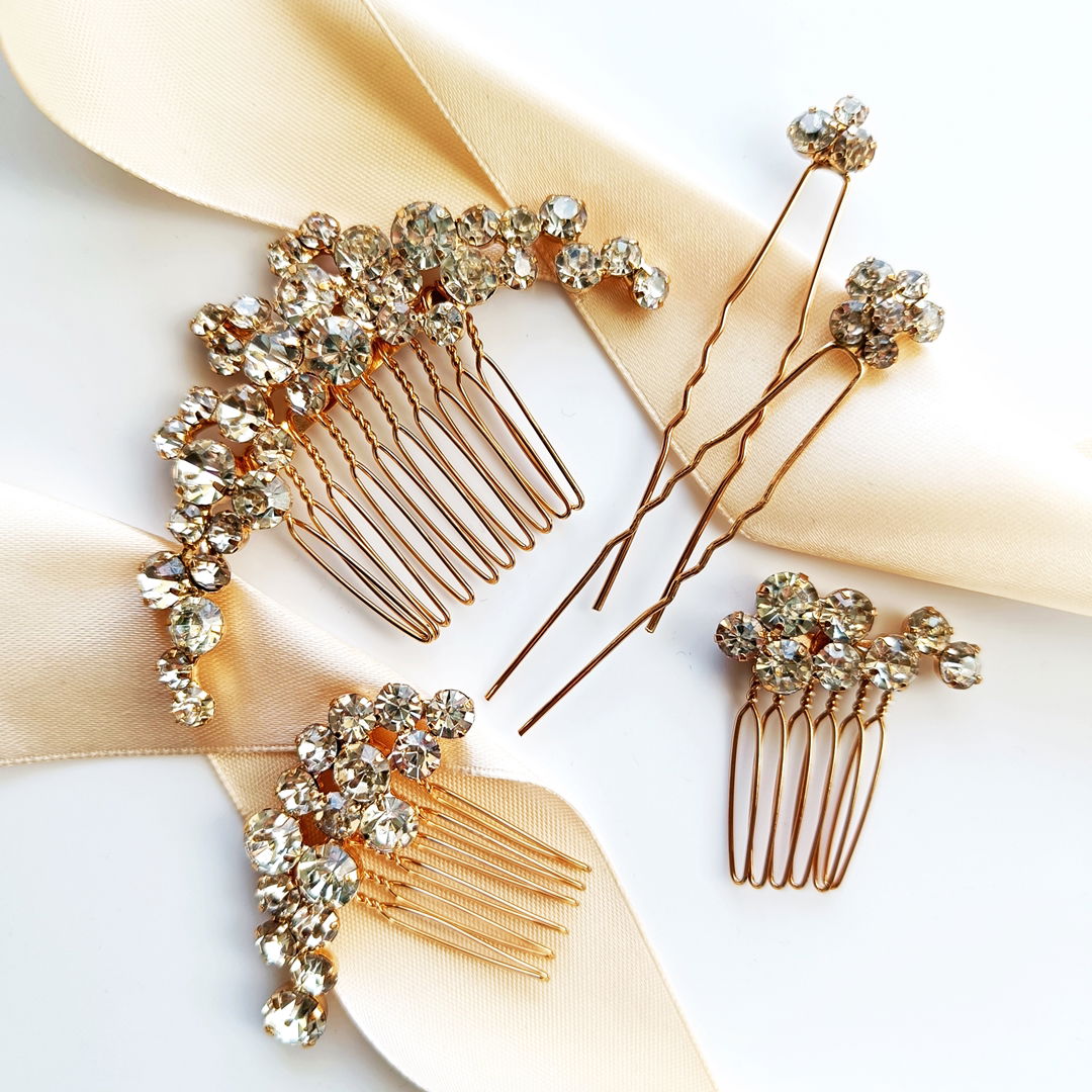 Piękny i elegancki zestaw złotych ozdób do włosów z powodzeniem doda blasku efektownej fryzurze ślubnej i nie tylko. Komplet składa się z trzech grzebyków o różnych wielkościach oraz dwóch kokówek, które pięknie się uzupełniają. Z tymi ozdobami możesz spokojnie budować efekt używając tylko jednego grzebyka, lub stworzyć zjawiskową konstrukcję przy użyciu całego zestawu.