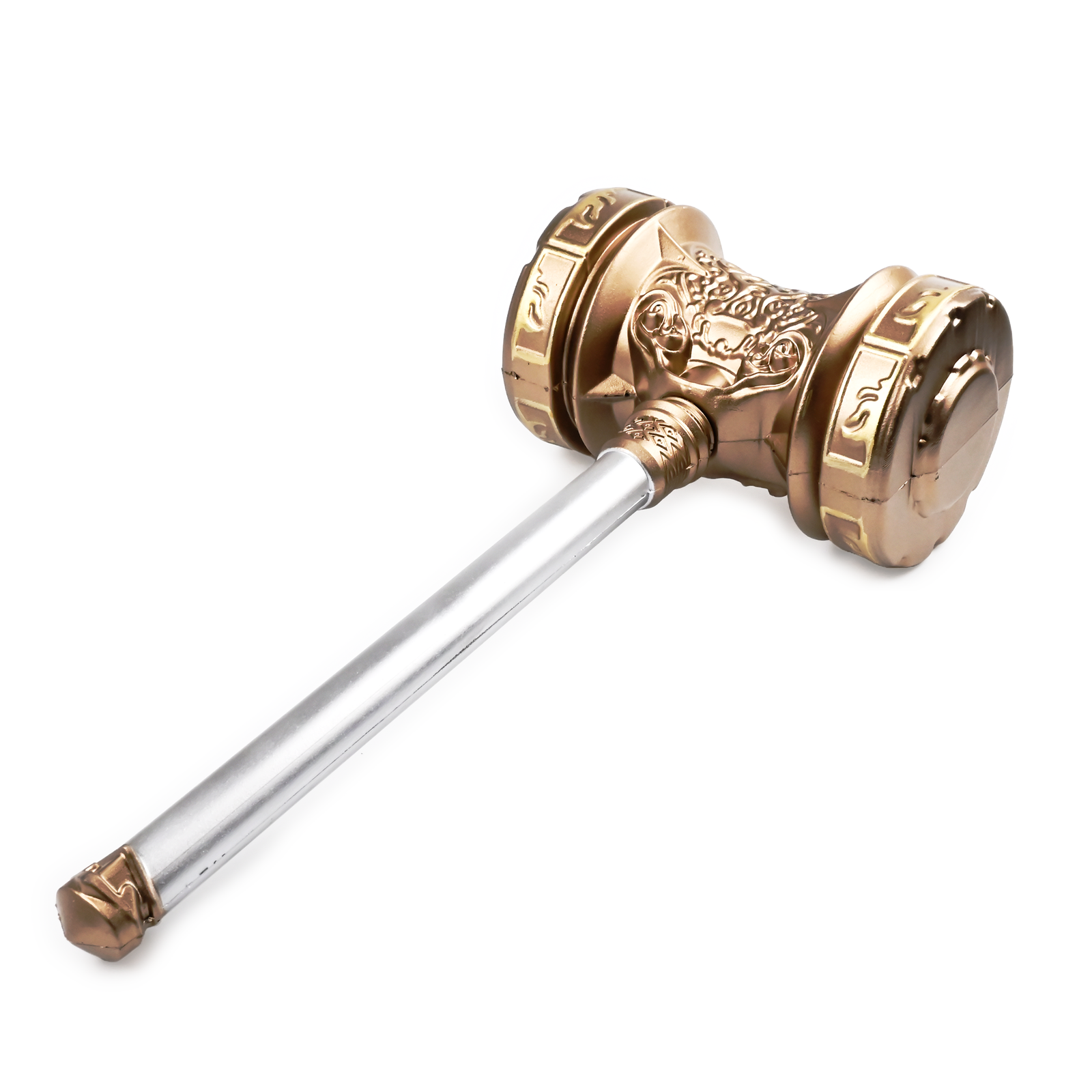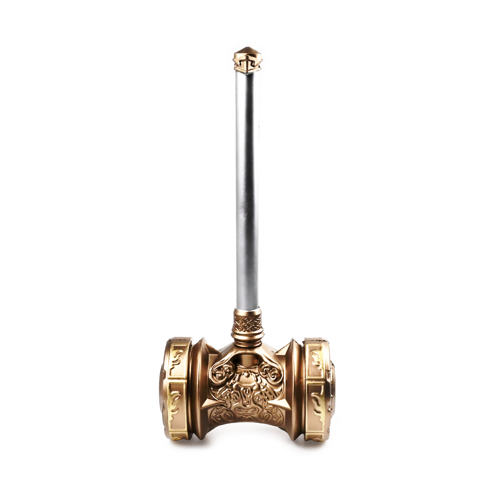 Młot ma błyszczący srebrny trzonek, który kontrastuje z głowicą z brązu, bogato grawerowaną wizerunkami mitycznych bestii i starożytnych run, nadając mu aurę mistycyzmu. Koniec rękojeści jest zwieńczony pasującym elementem z brązu, co dodaje mu wyważonego i imponującego wyglądu. Jednocześnie lekki i wytrzymały, ten piankowy młot został zaprojektowany z myślą o epickich przygodach, pozwalając na bezpieczną, żywiołową zabawę bez uszczerbku dla szczegółowej estetyki niezbędnej do wciągającej rozgrywki fabularnej. Służy nie tylko jako zabawny dodatek, ale także jako część kolekcji, oddając ducha bogatej narracji gry. Niezależnie od tego, czy młot będzie trzymany przez młodego bohatera w drodze do sławy, czy też będzie eksponowany na honorowym miejscu wśród innych przedmiotów kolekcjonerskich, ten młot jest zaproszeniem do tworzenia własnej legendy, ucieleśniającej esencję czarującego i burzliwego świata Krainy Dusz.