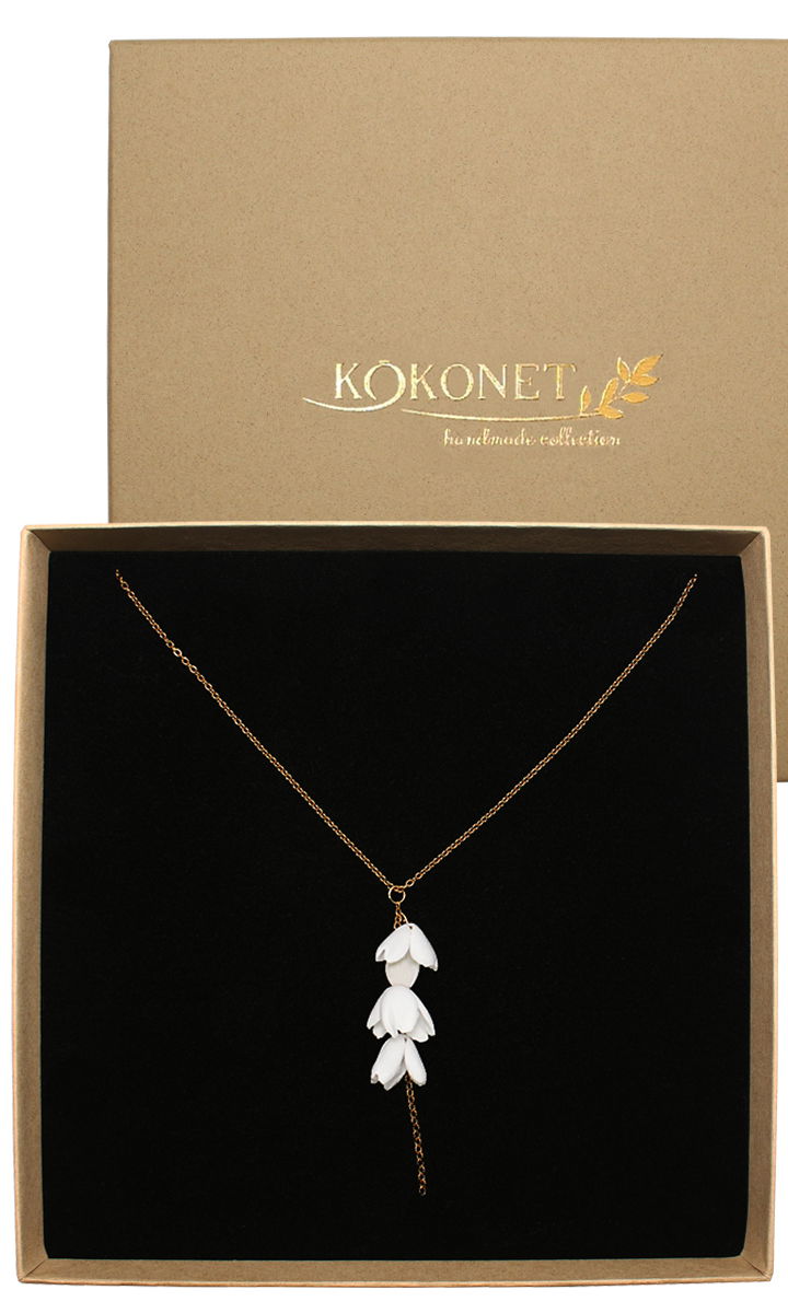 Złoty naszyjnik ślub z białymi kwiatami KRAWATKA DEKOLT V lekki delikatny
