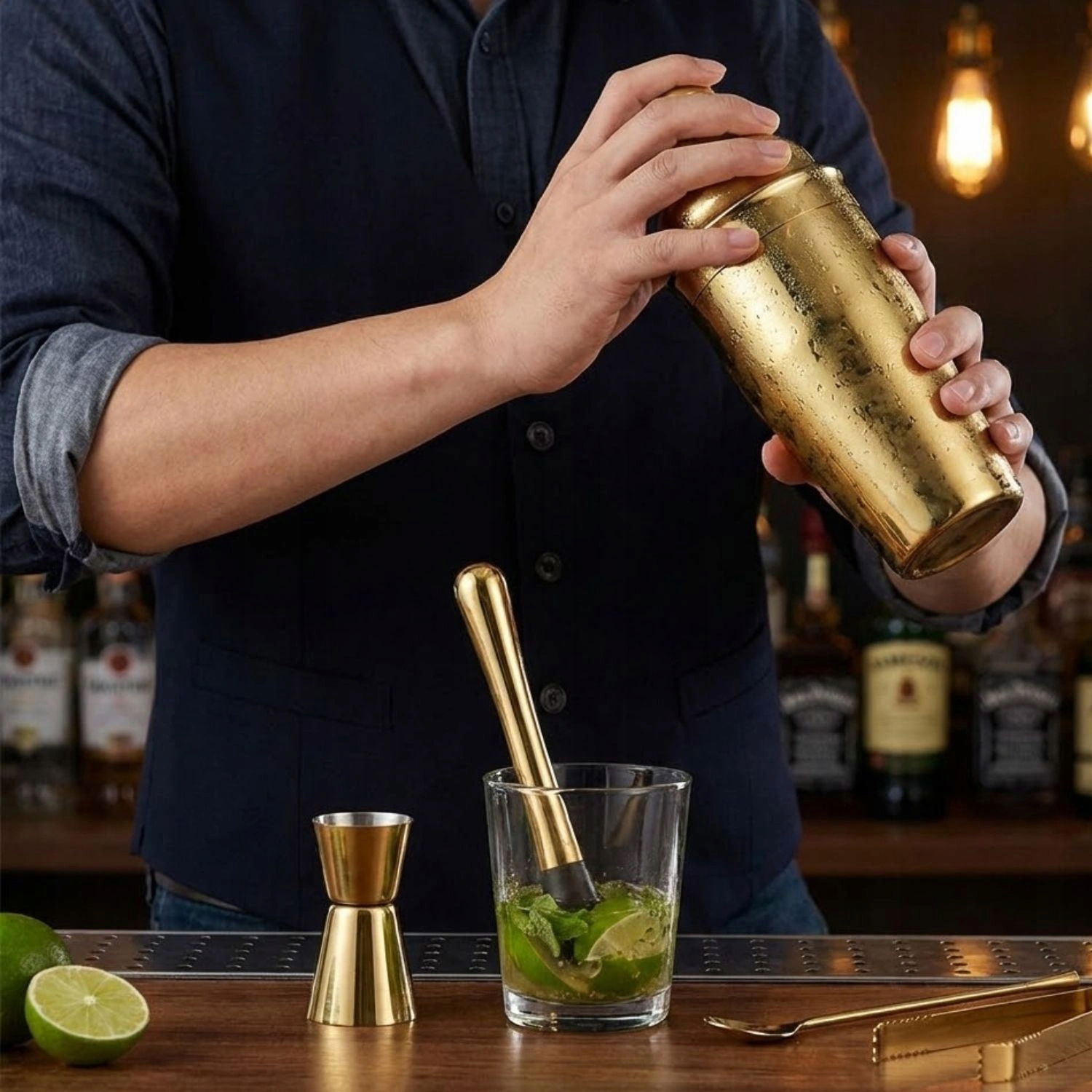 - Tłuczek Barmański (Muddler): Niezbędny do wyciskania esencji z owoców i ziół (np. mięty i limonki). Złota rączka zakończona jest teksturowaną, czarną końcówką dla efektywnego ugniatania.