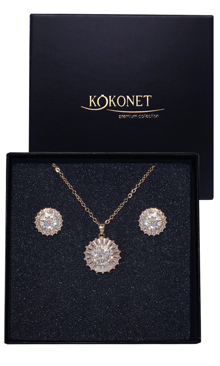 MEGHAN to propozycja eleganckiego i klasycznego złotego kompletu biżuterii ślubnej składającego się z okrągłych kolczyków wysadzanych w całości błyszczącymi cyrkoniami wraz z regulowanym naszyjnikiem z pasująca zawieszką. Idealny zestaw biżuterii podkreślający klasyczne stylizacje nie tylko na ślub.