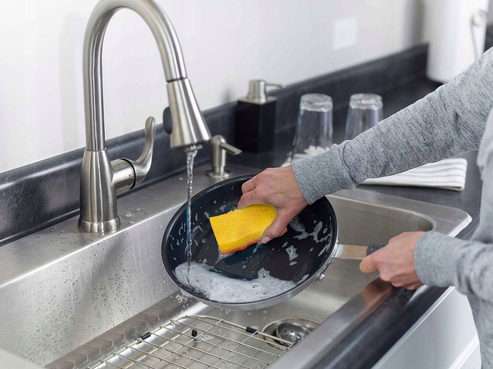 Zmywak kuchenny, który usuwa uporczywe zabrudzenia, nie pozostawiając zarysowań na nawet na tak delikatnych powierzchniach jak teflon