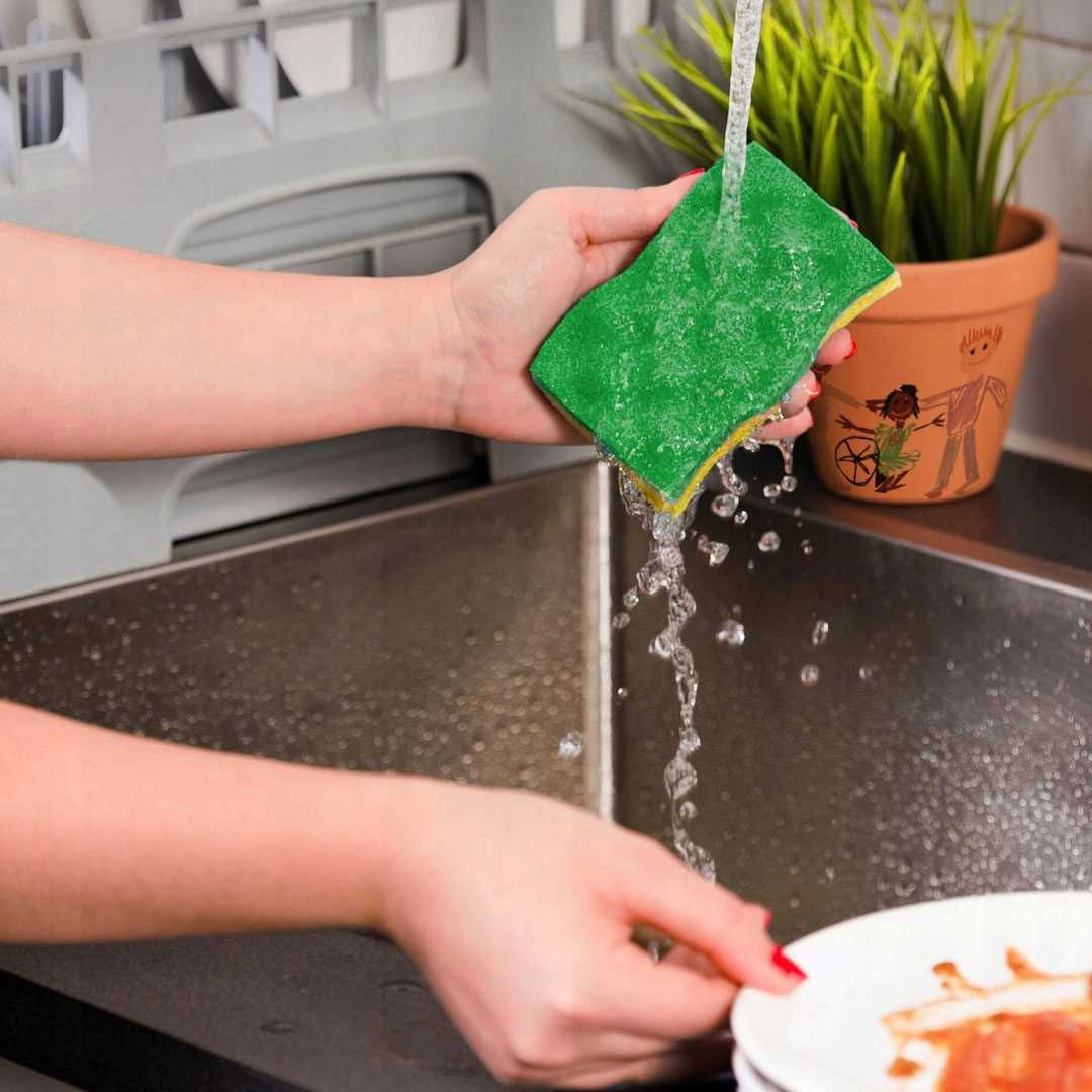 Zmywak Vileda Pur Active Colors łatwo się spłukuje, dzięki czemu pozostaje świeży na dłużej. Zestaw zawiera 4 gąbki w różnych kolorach.