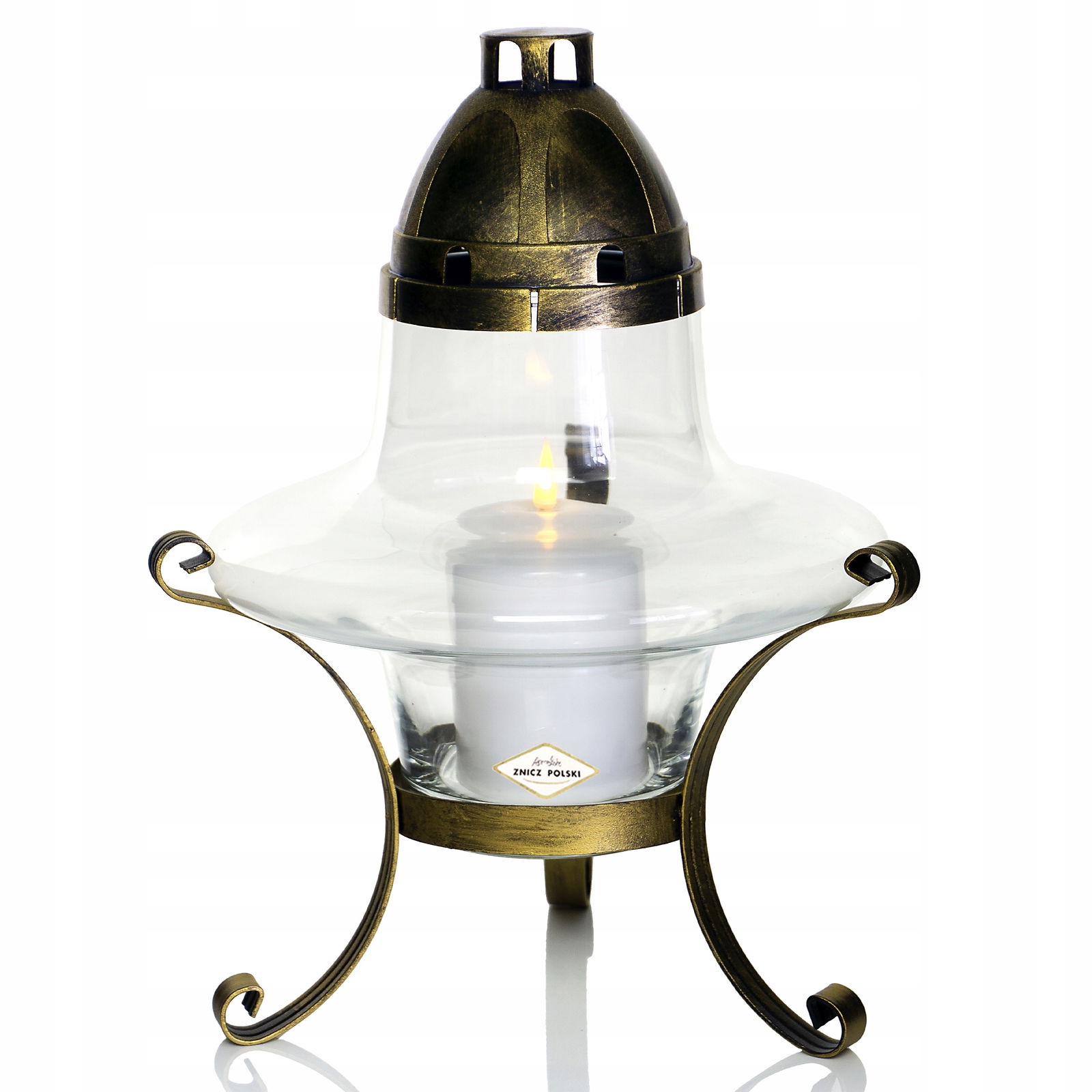 Artystyczny znicz szklany na stalowej podstawie ZA UFO złoty