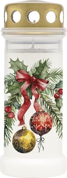 Zalewany plastikowy znicz w złotej stylistyce marki BOLSIUS. Grafika z wstążką świąteczną ozdobioną bombkami, czerwoną kokardą i jemiołą to połączenie eleganckiego, nowoczesnego designu z tradycyjną symboliką świąt. Solidna szeroka podstawa zapewnia stabilność, a gruby, wysokiej jakości plastik gwarantuje trwałość i odporność na warunki atmosferyczne. Metalowe, złote wieczko dodaje wyrafinowanego charakteru, podkreślając elegancję całości, a wosk bez dodatku oleju palmowego czyni znicz ekologicznym wyborem. Może być używany jako samodzielny znicz lub jako wkład do większych szklanych lampionów bądź latarni. To doskonały wybór dla osób ceniących estetykę, trwałość i głęboką symbolikę.
