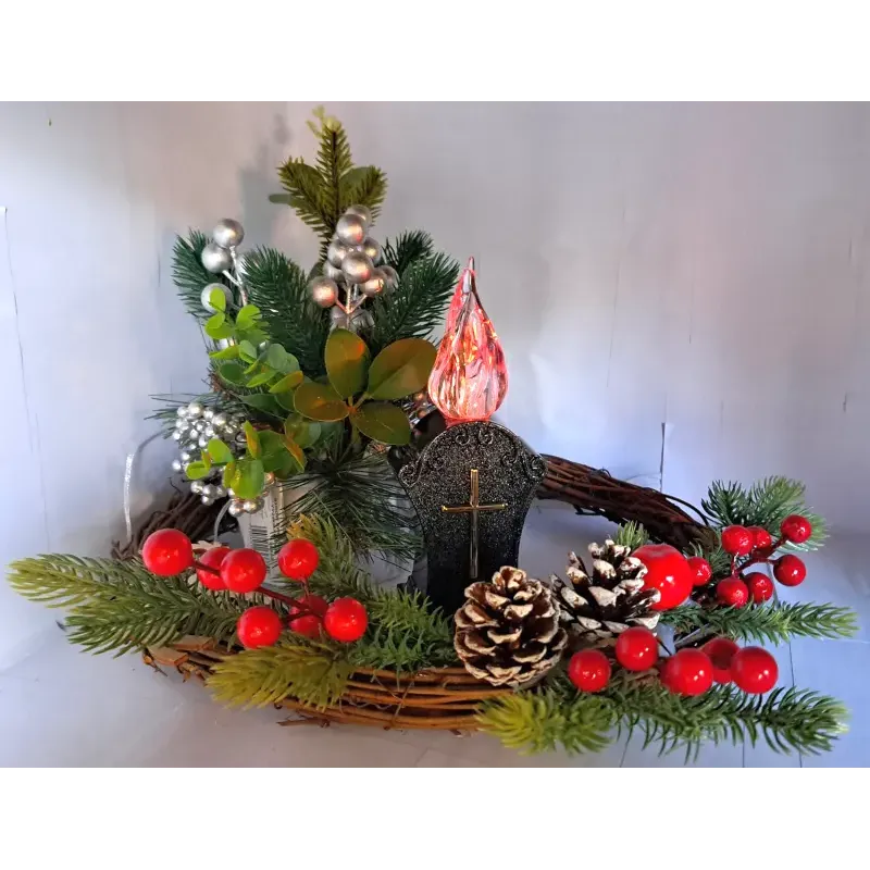 Znicz solarny LED żywy płomień dekoracyjny czarny z krzyżykiem na grub Czerwony